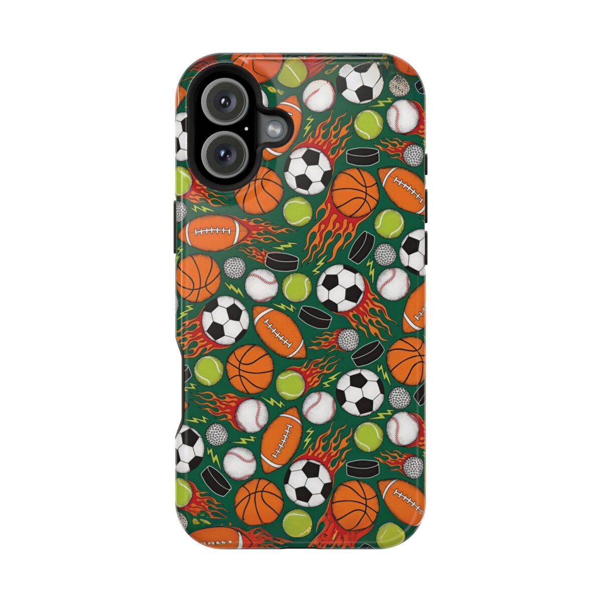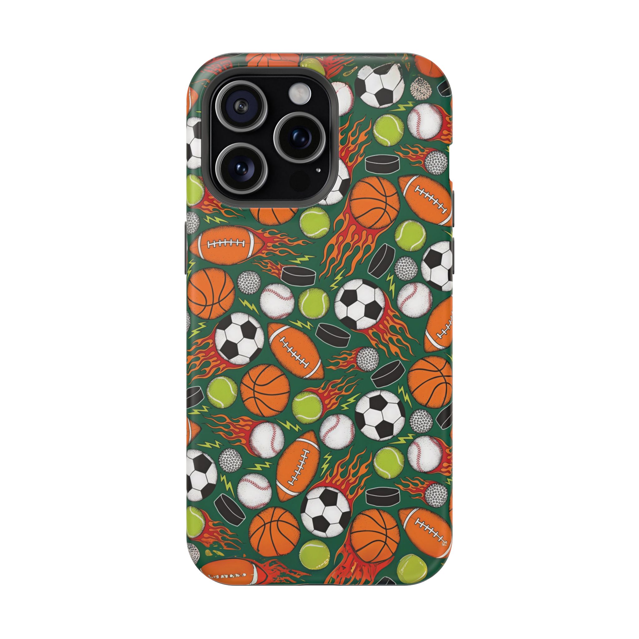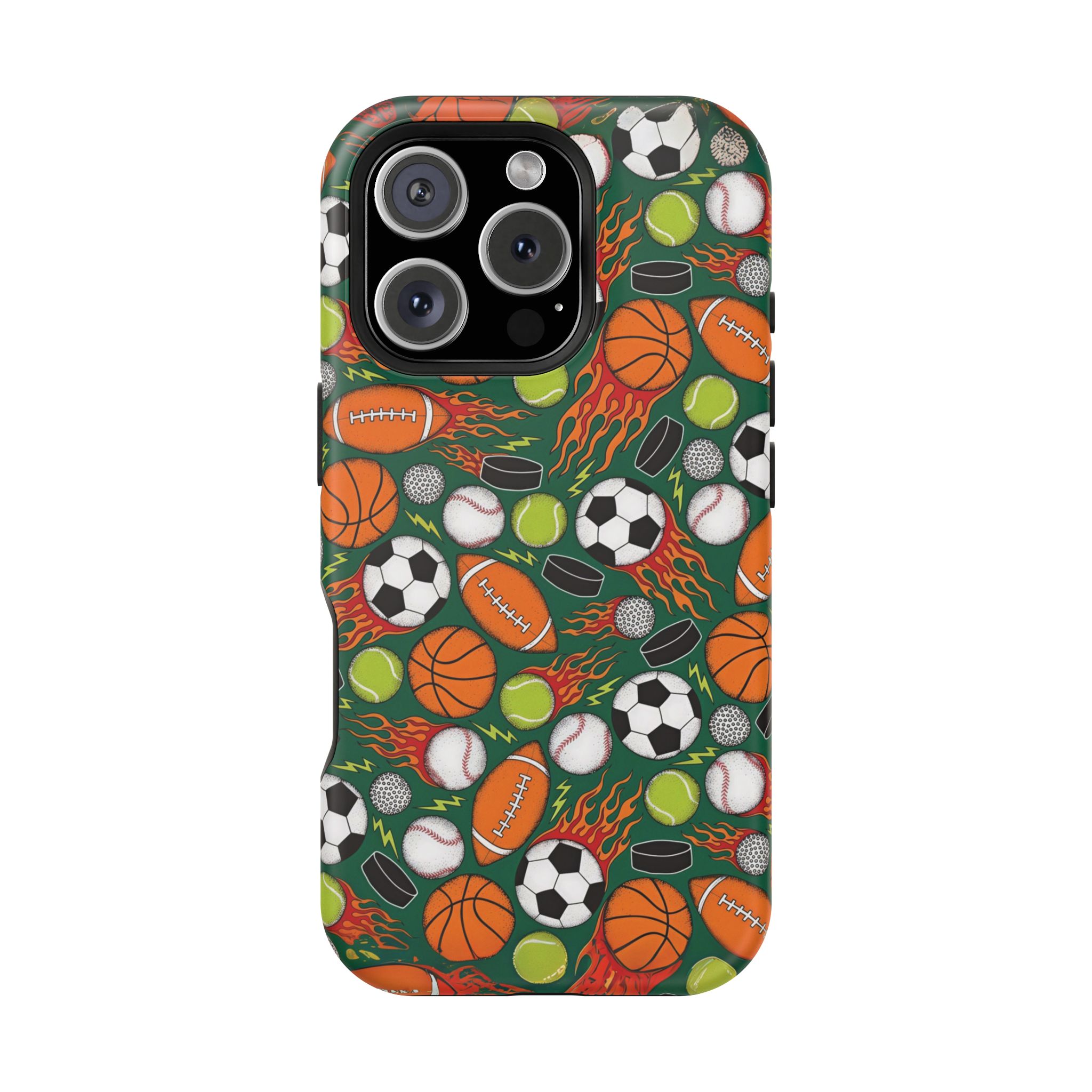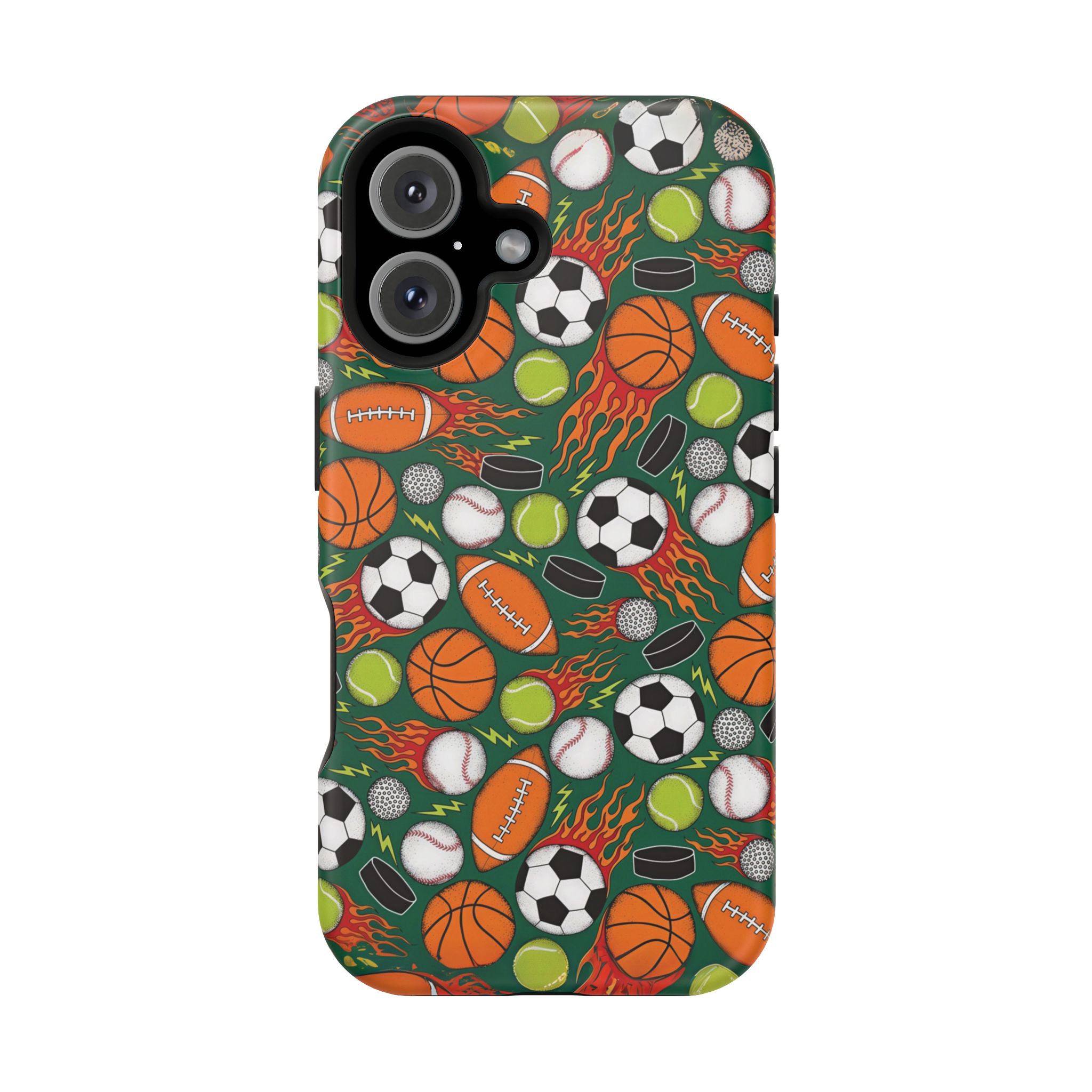 Ignite your passion for every game with the Blaze Arena | Sports Fusion iPhone Case. From flaming basketballs to footballs, soccer balls, tennis, baseball, golf, and hockey icons, this design bursts with unstoppable energy on a bold green background. It’s the perfect choice for fans who celebrate every sport in one powerful look. Choose your finish: glossy for a striking shine or matte for a smooth, modern edge. Built with a two-piece polycarbonate shell and TPU lining, it offers reliable drop protection while keeping your iPhone slim and stylish. Inside, the rubber liner absorbs shocks, and the case is fully MagSafe compatible, making charging and accessories effortless. Exclusively crafted for iPhone 13, 14, 15, and 16 series, the Blaze Arena Case brings strength, energy, and game-day passion straight to your pocket.- Compatibility: iPhone 13, iPhone 14, iPhone 15, iPhone 16 series