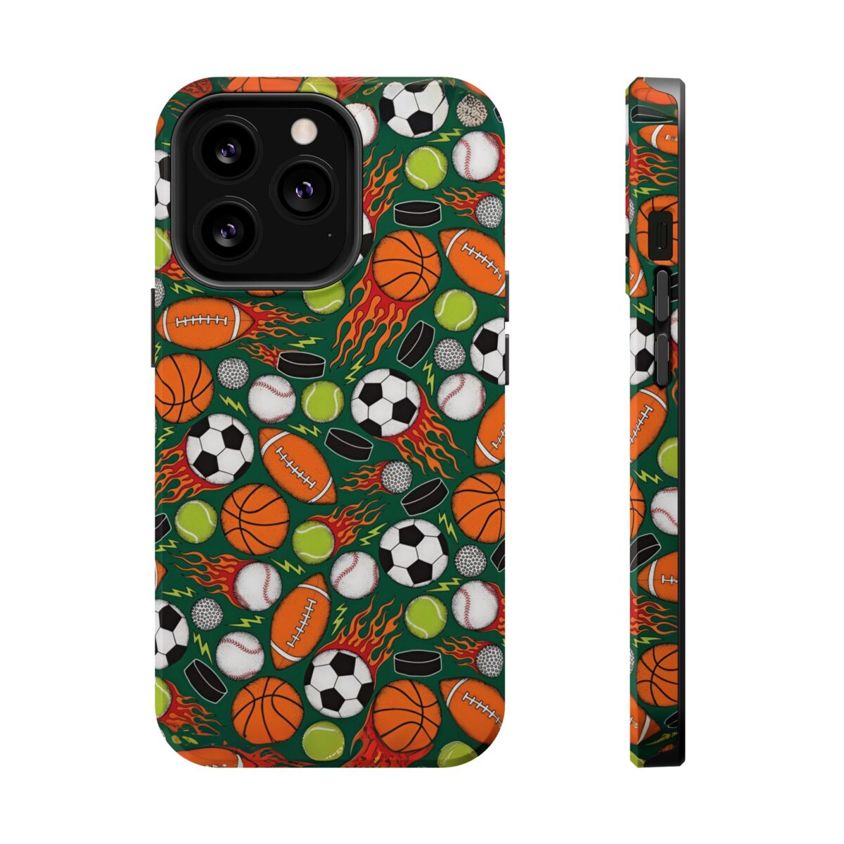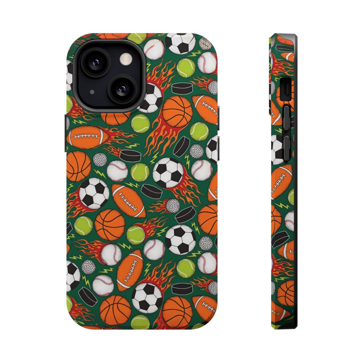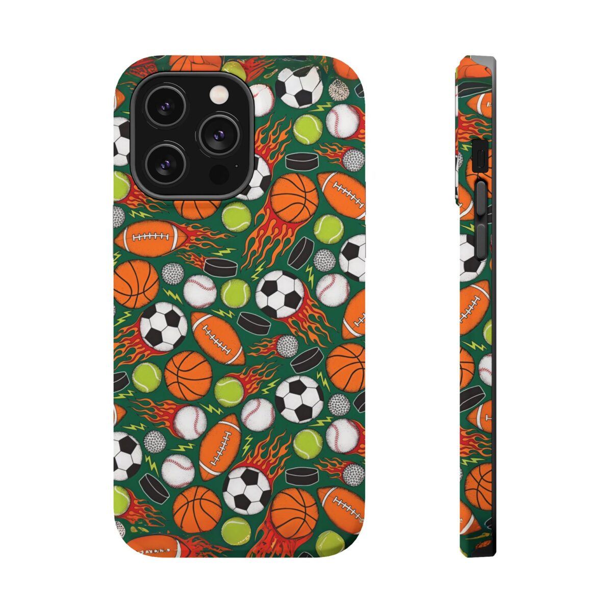 Ignite your passion for every game with the Blaze Arena | Sports Fusion iPhone Case. From flaming basketballs to footballs, soccer balls, tennis, baseball, golf, and hockey icons, this design bursts with unstoppable energy on a bold green background. It’s the perfect choice for fans who celebrate every sport in one powerful look. Choose your finish: glossy for a striking shine or matte for a smooth, modern edge. Built with a two-piece polycarbonate shell and TPU lining, it offers reliable drop protection while keeping your iPhone slim and stylish. Inside, the rubber liner absorbs shocks, and the case is fully MagSafe compatible, making charging and accessories effortless. Exclusively crafted for iPhone 13, 14, 15, and 16 series, the Blaze Arena Case brings strength, energy, and game-day passion straight to your pocket.- Compatibility: iPhone 13, iPhone 14, iPhone 15, iPhone 16 series