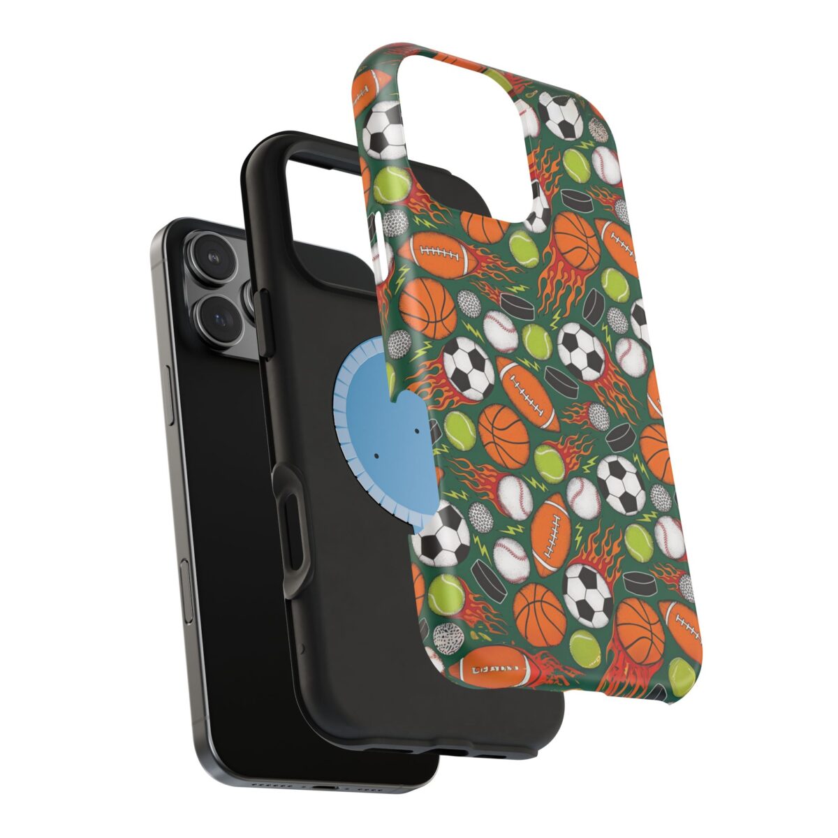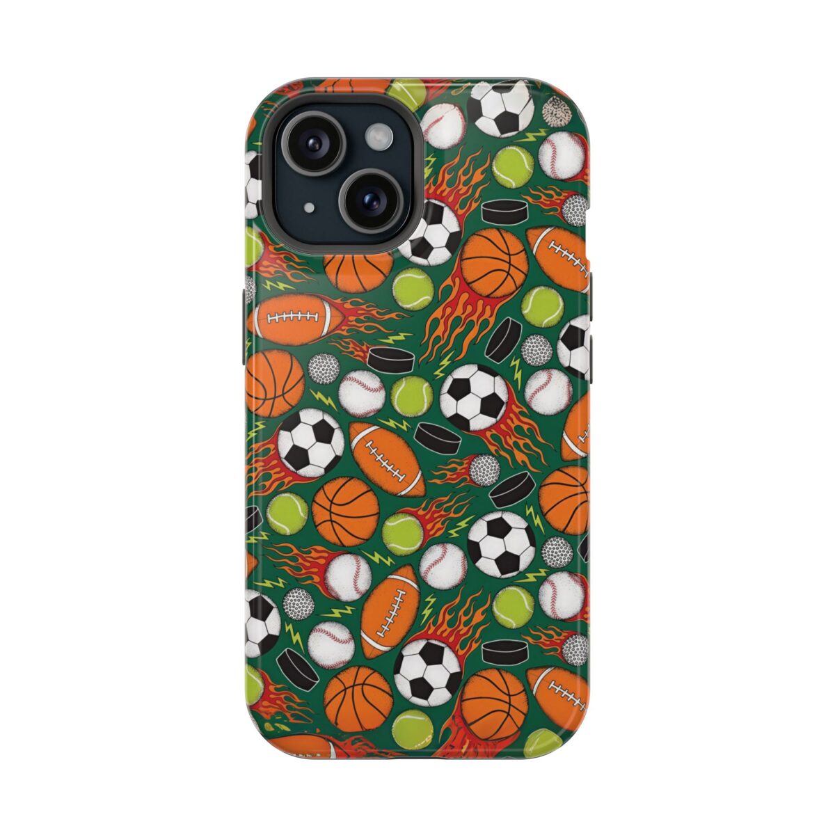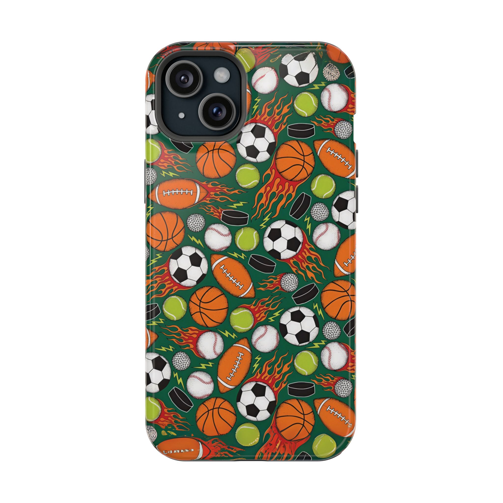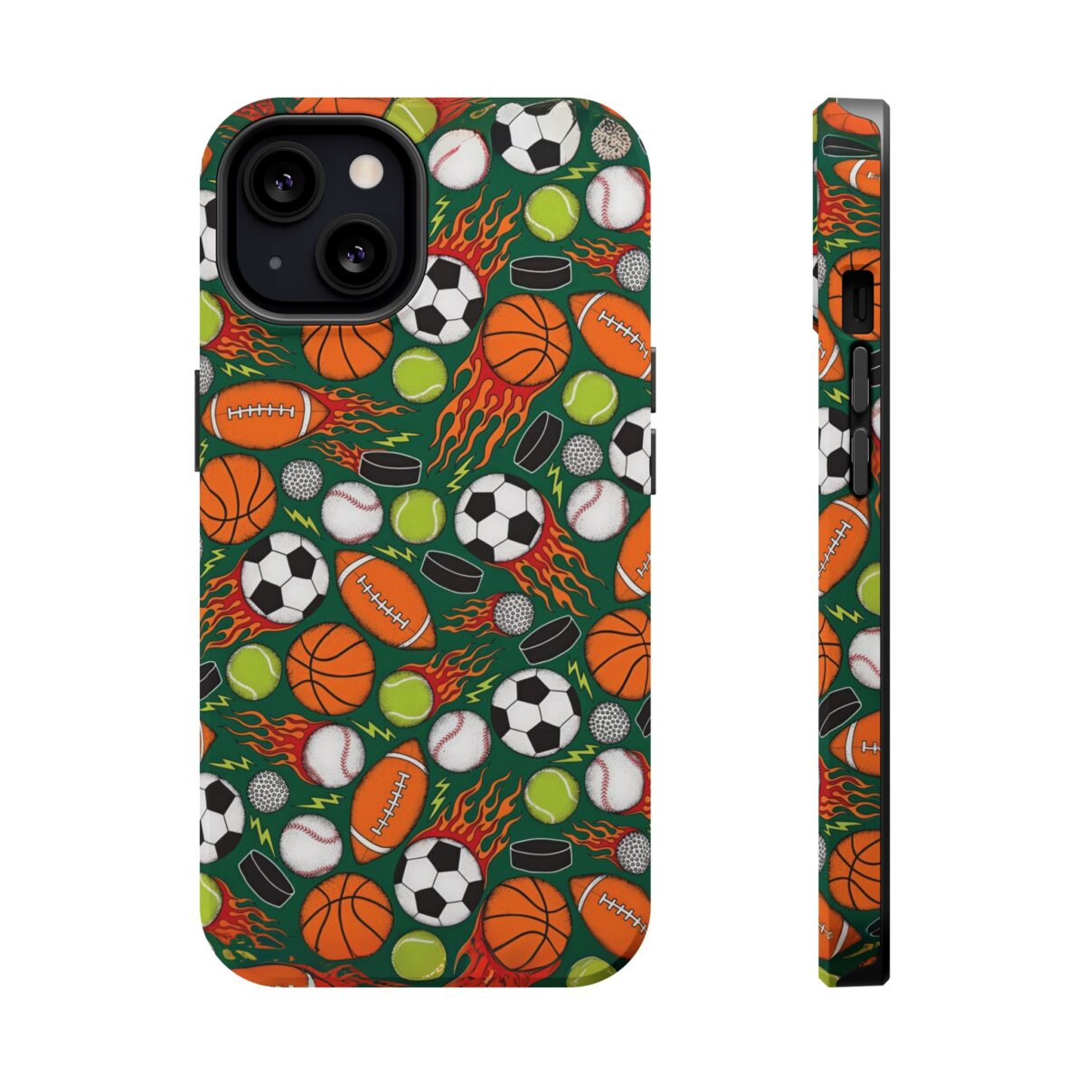 Ignite your passion for every game with the Blaze Arena | Sports Fusion iPhone Case. From flaming basketballs to footballs, soccer balls, tennis, baseball, golf, and hockey icons, this design bursts with unstoppable energy on a bold green background. It’s the perfect choice for fans who celebrate every sport in one powerful look. Choose your finish: glossy for a striking shine or matte for a smooth, modern edge. Built with a two-piece polycarbonate shell and TPU lining, it offers reliable drop protection while keeping your iPhone slim and stylish. Inside, the rubber liner absorbs shocks, and the case is fully MagSafe compatible, making charging and accessories effortless. Exclusively crafted for iPhone 13, 14, 15, and 16 series, the Blaze Arena Case brings strength, energy, and game-day passion straight to your pocket.- Compatibility: iPhone 13, iPhone 14, iPhone 15, iPhone 16 series
