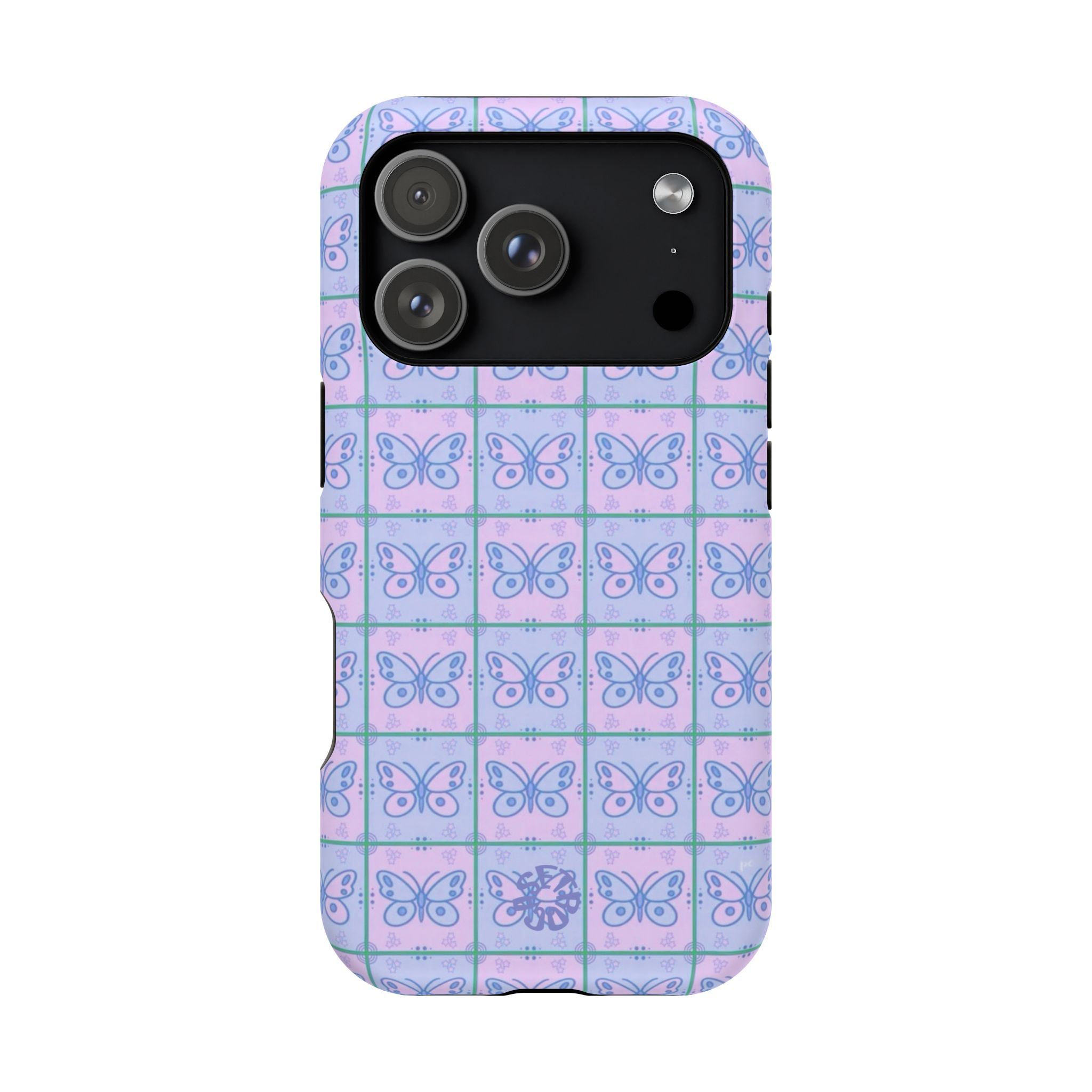 The Butterfly Dream case brings a soft, whimsical charm with its pastel lavender butterfly phone case aesthetic. Each tile in the gentle pastel grid pattern features a simple, dreamy butterfly illustration in shades of pink, blue, and purple, creating a cohesive butterfly aesthetic design that feels airy and youthful. This style perfectly fits fans of soft girl accessories, pastel aesthetic covers, and light, dreamy Y2K vibes.