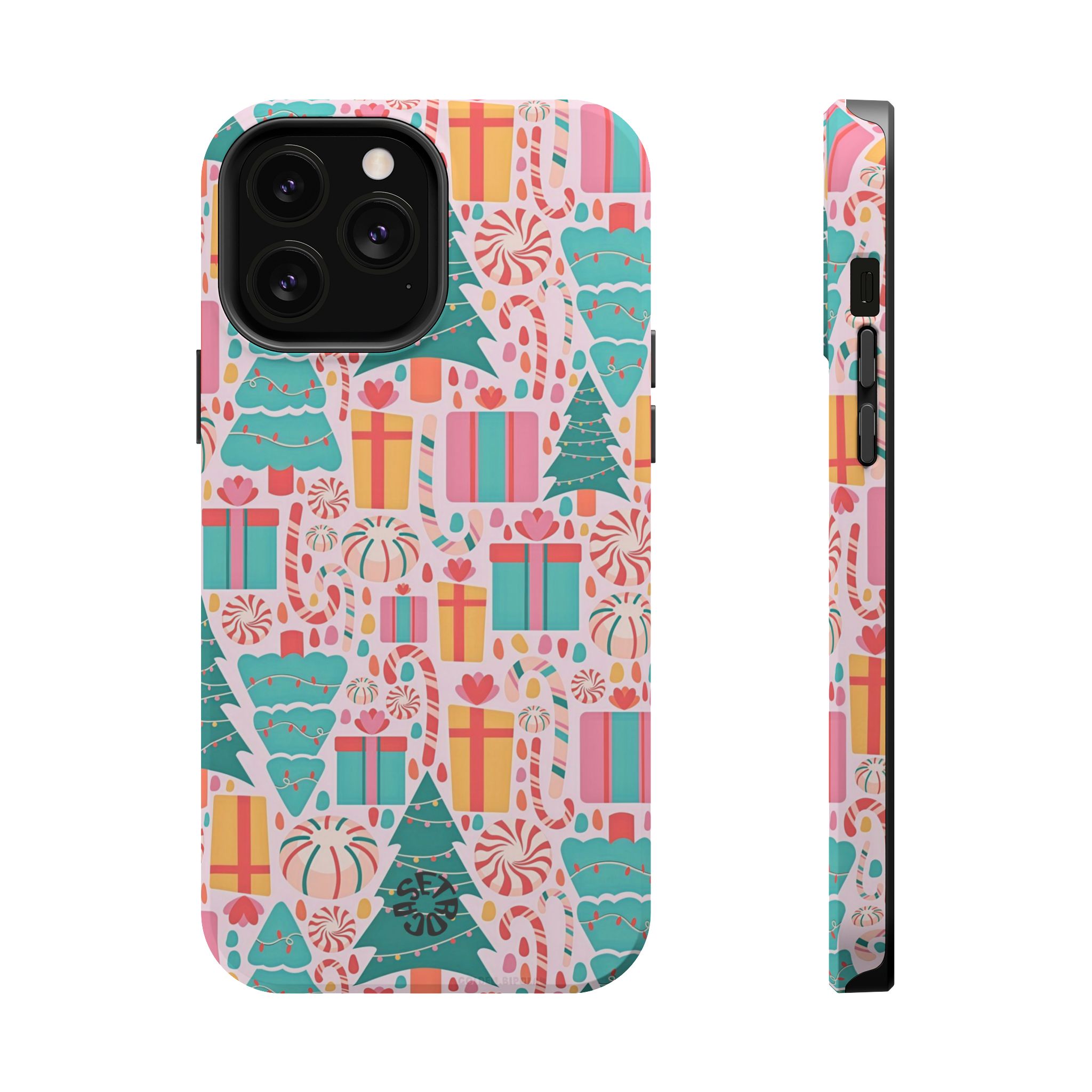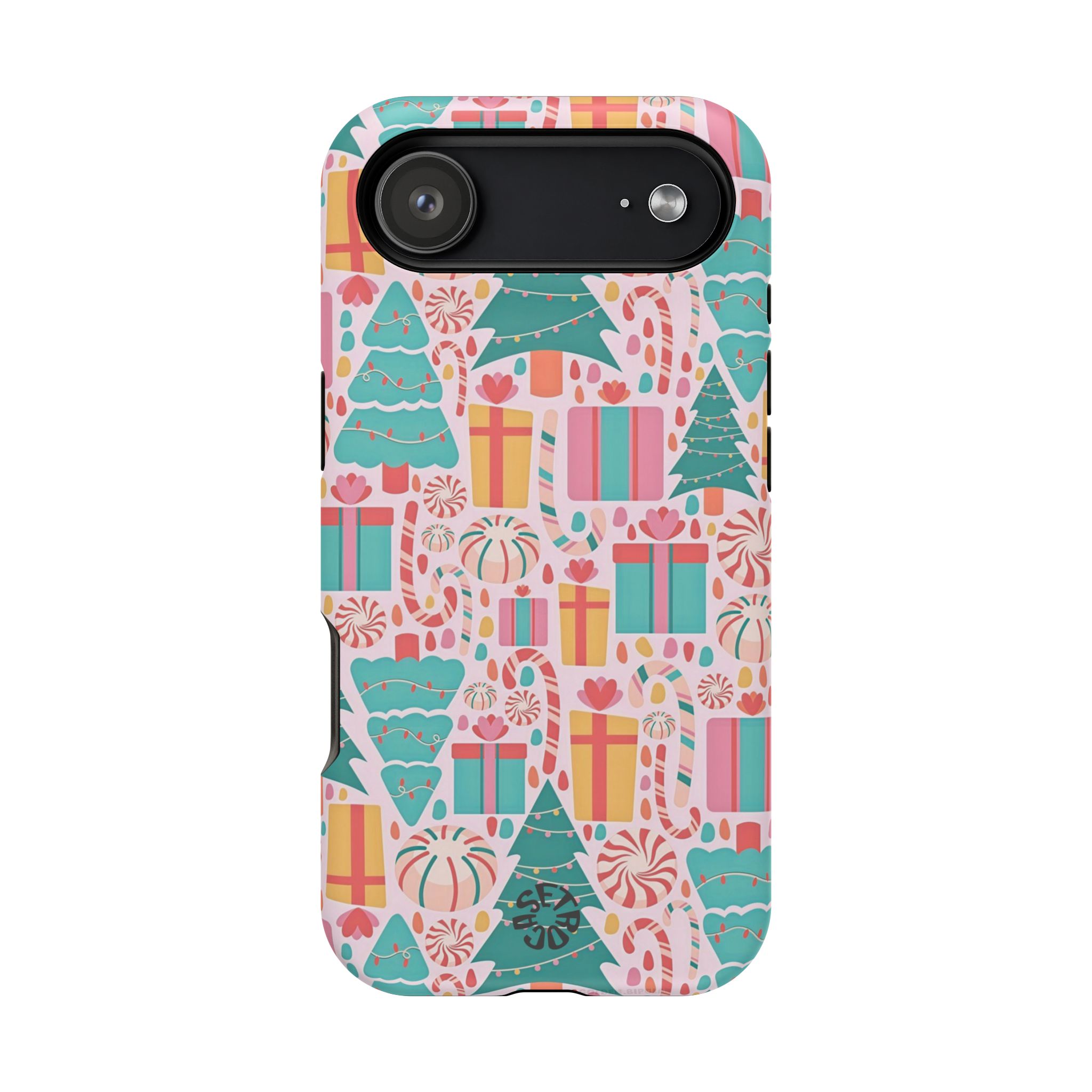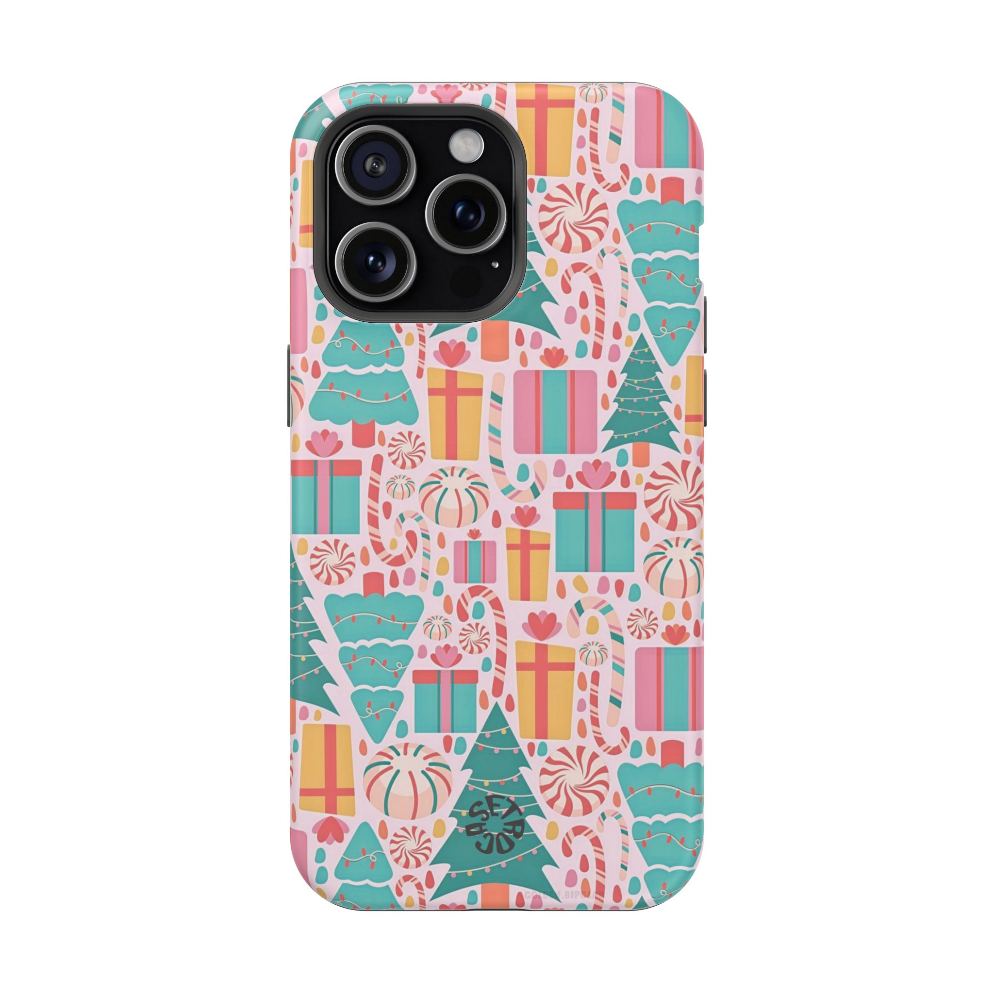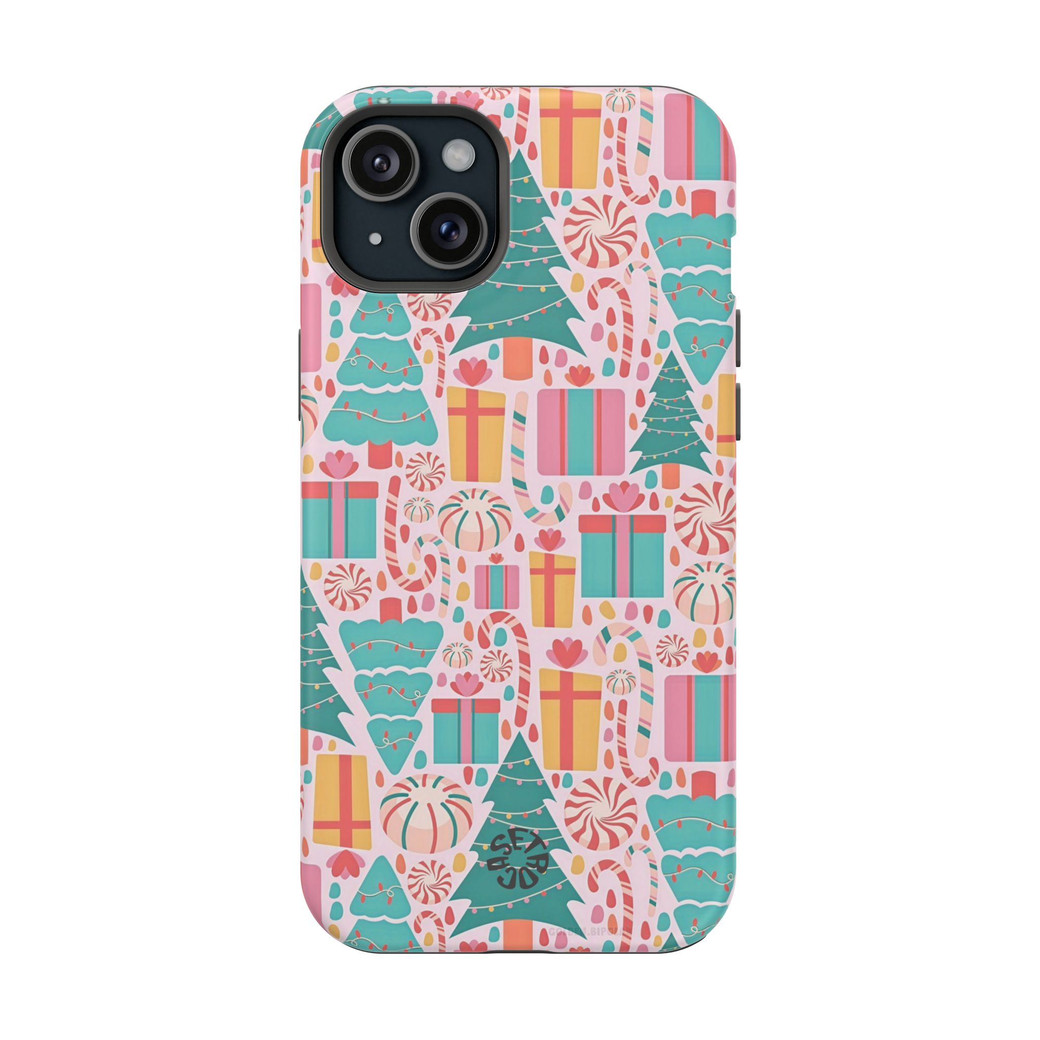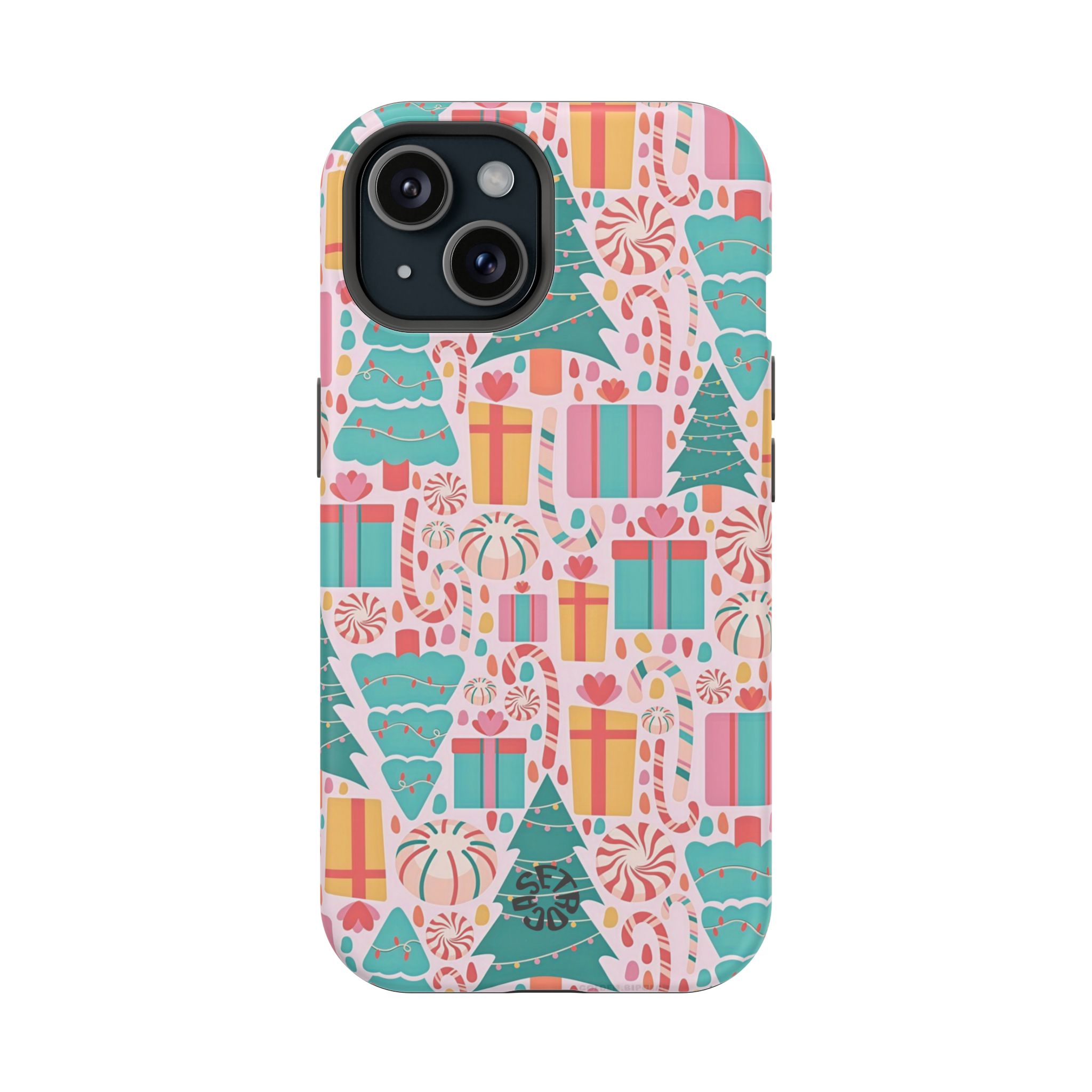 A festive holiday case with colorful gifts and Christmas trees, featuring dual-layer drop protection, a smooth matte finish, and durable everyday style.
