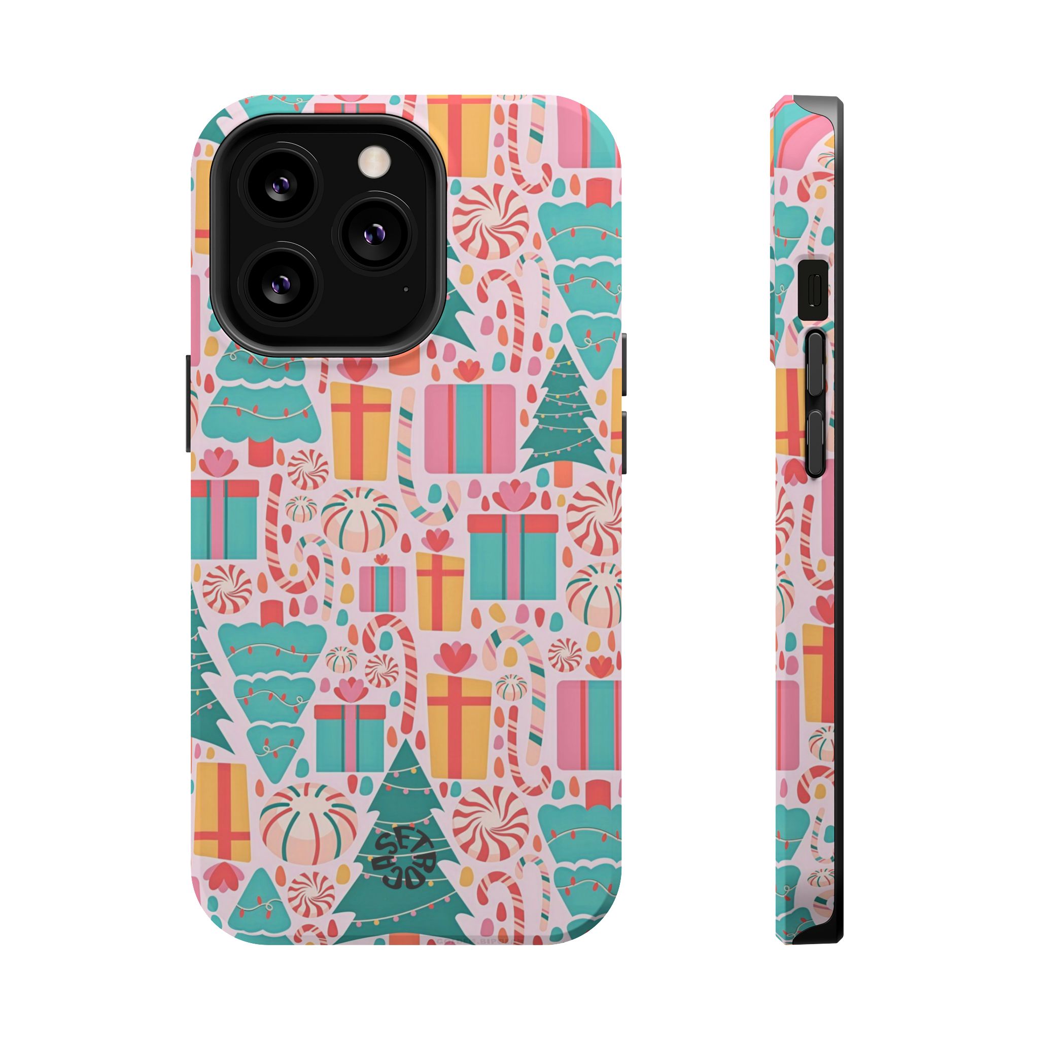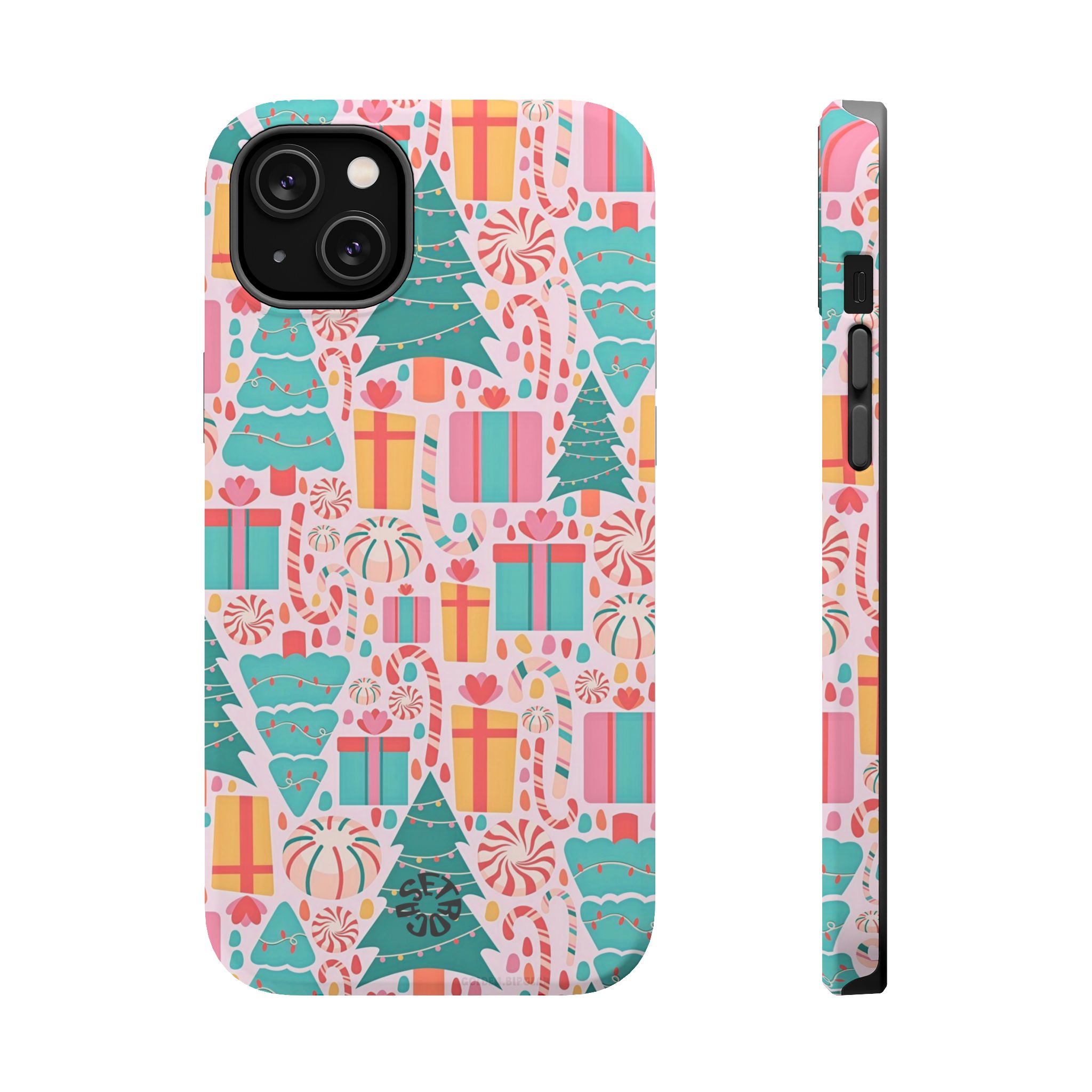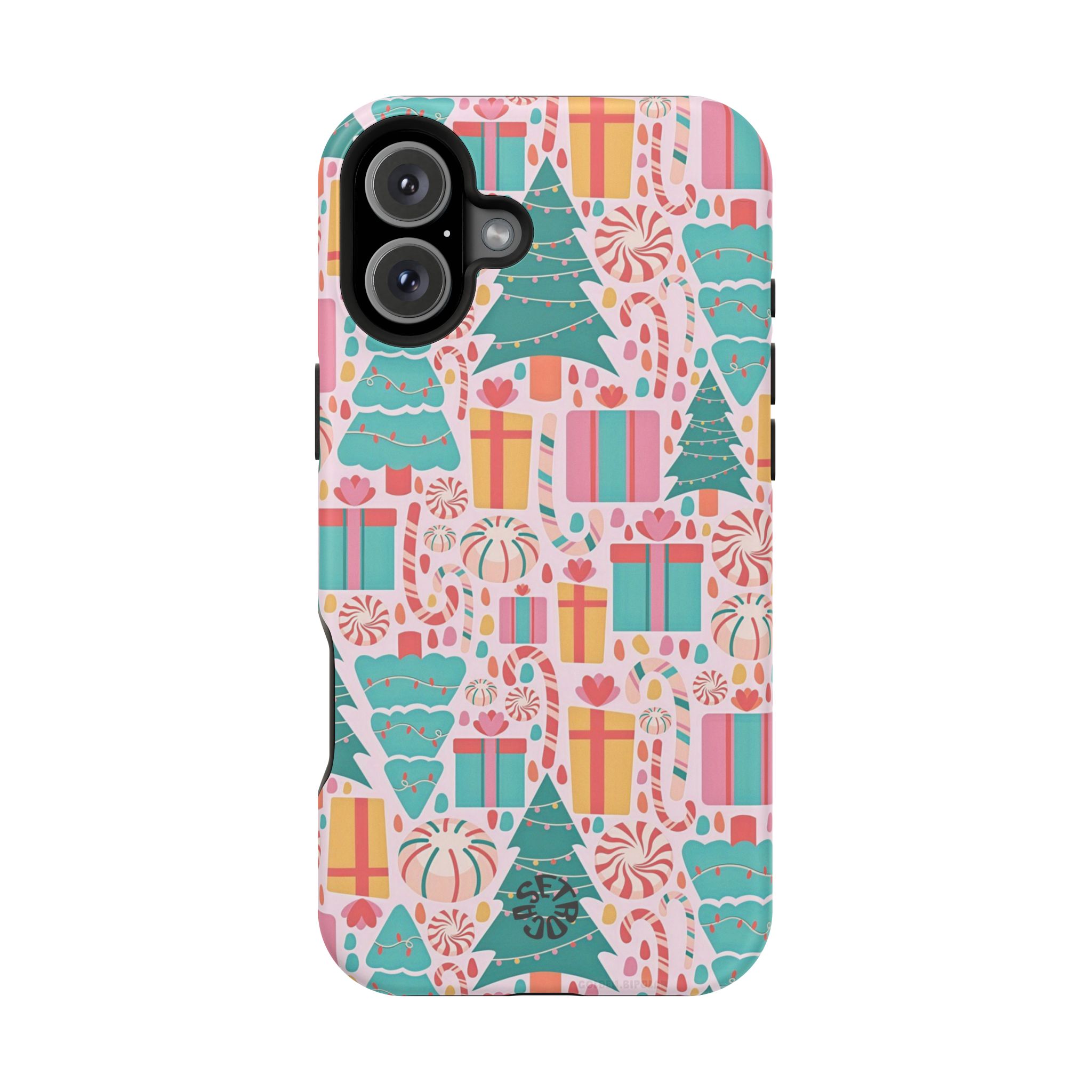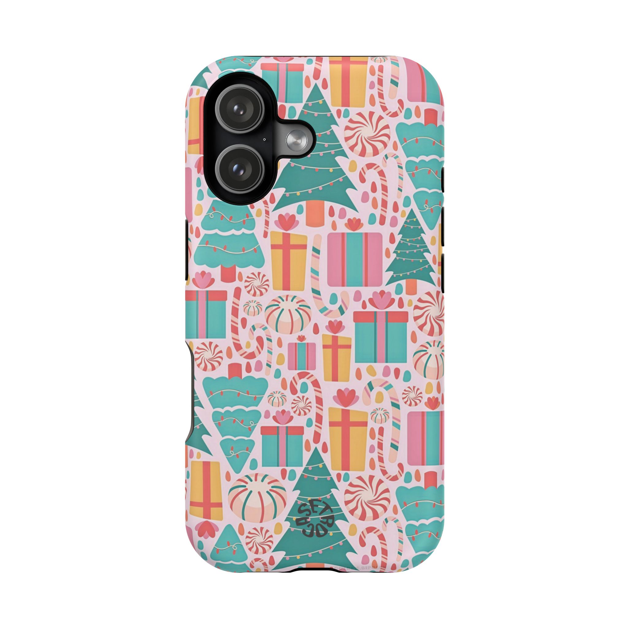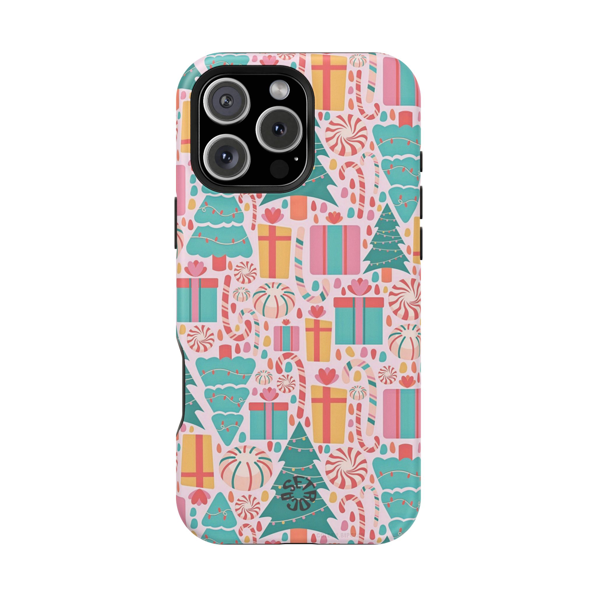 A festive holiday case with colorful gifts and Christmas trees, featuring dual-layer drop protection, a smooth matte finish, and durable everyday style.