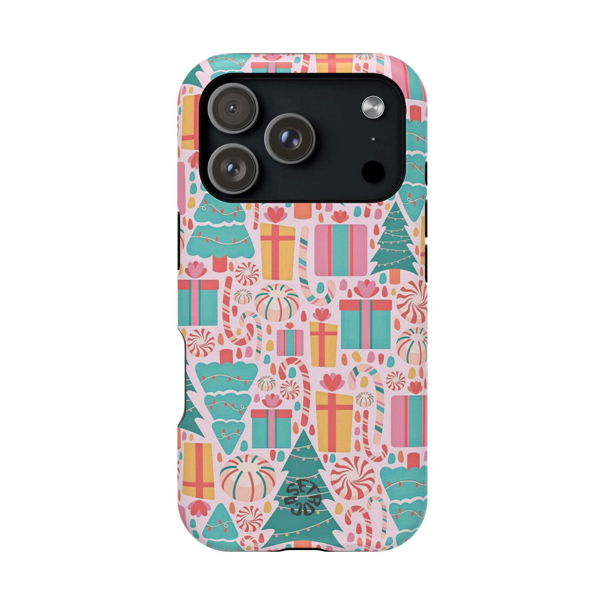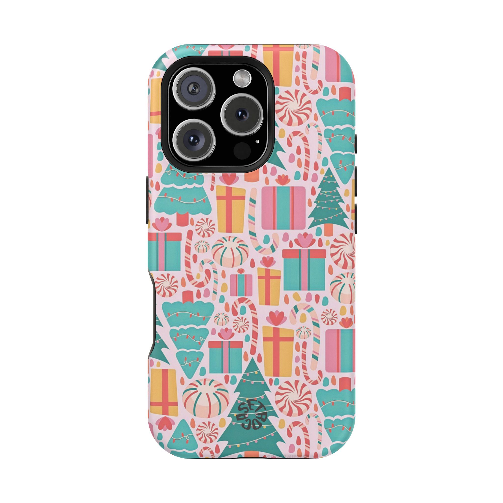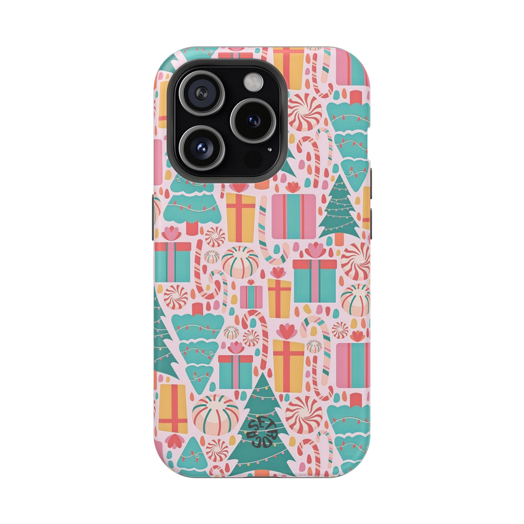 Bring cheerful holiday vibes to your phone with this vibrant Festive Joy case. The design features a playful mix of wrapped gifts, candy swirls, ornaments, and stylized Christmas trees, all arranged across a soft pink background. Bright teal, red, and yellow accents add a fun seasonal touch, creating an aesthetic that feels warm, joyful, and perfect for holiday lovers.