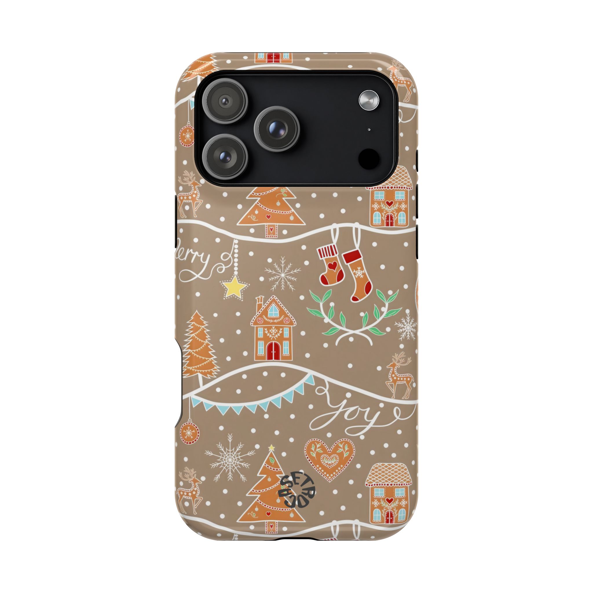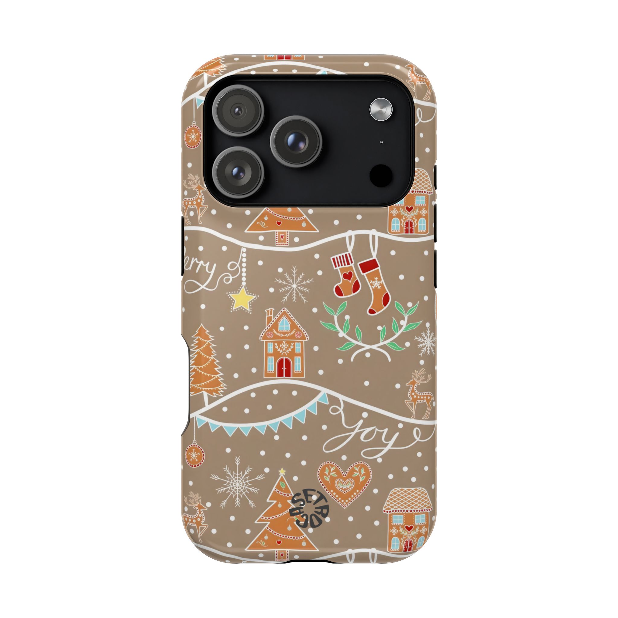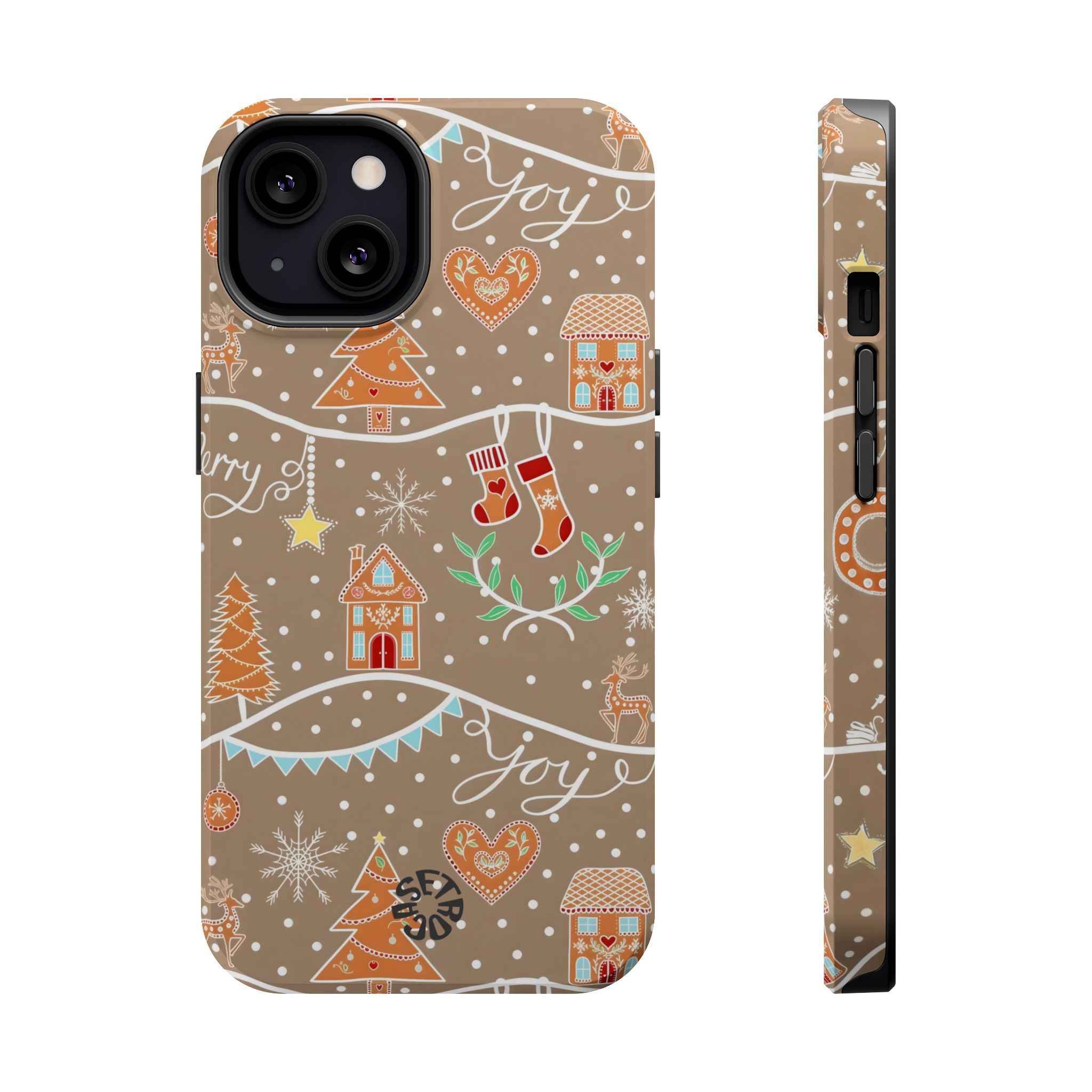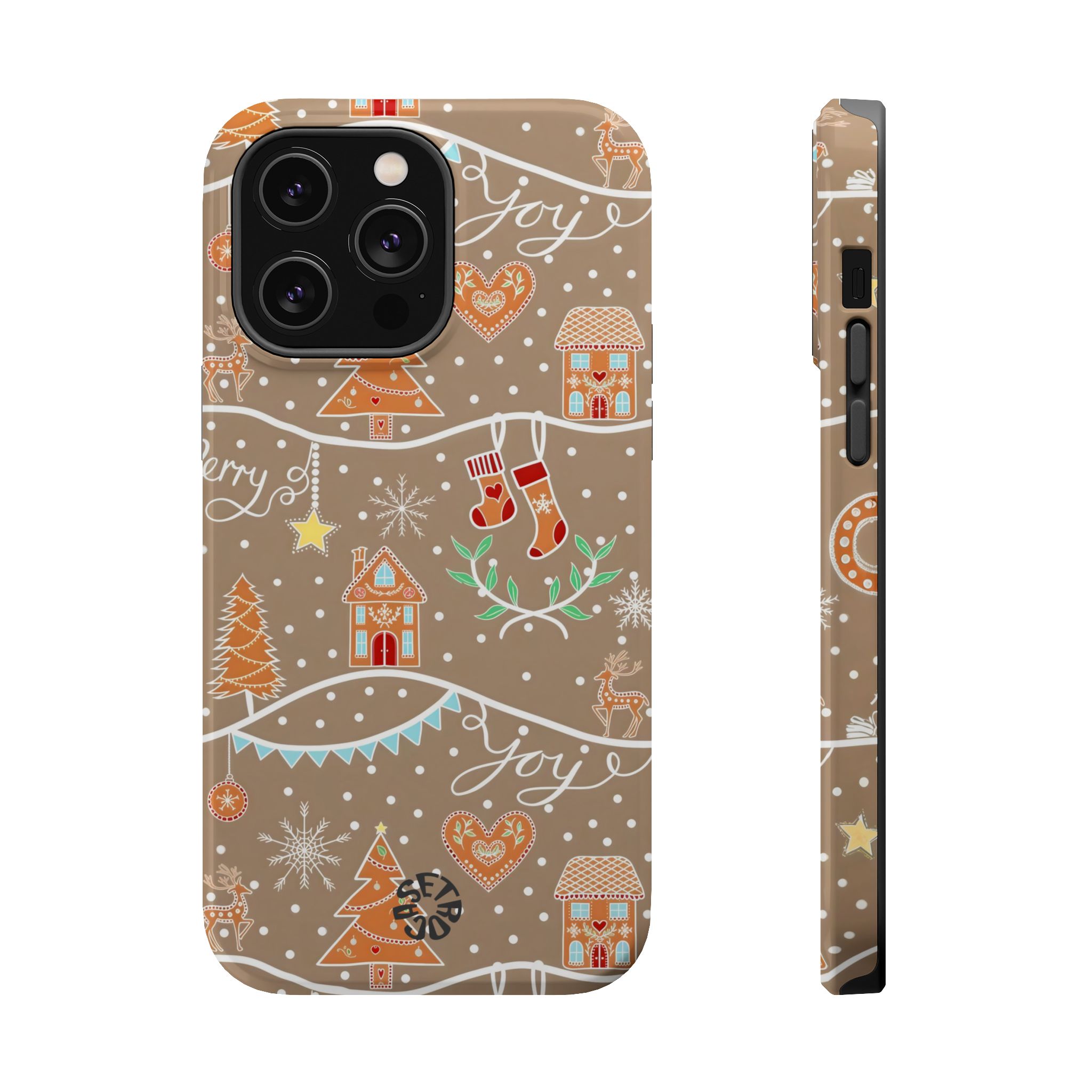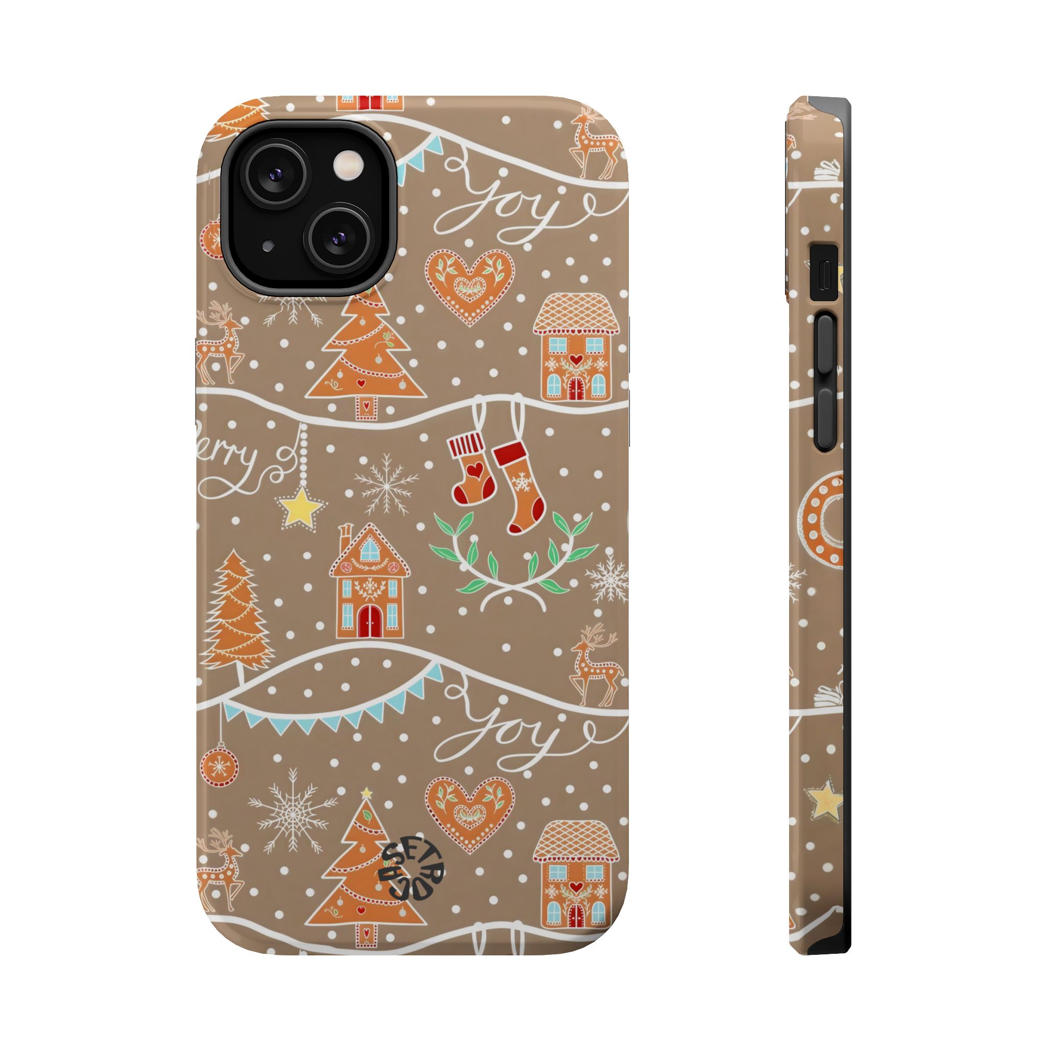 A cozy gingerbread holiday case with cute Christmas motifs, warm neutral tones, festive doodles, dual-layer protection, and a matte anti-scratch finish.