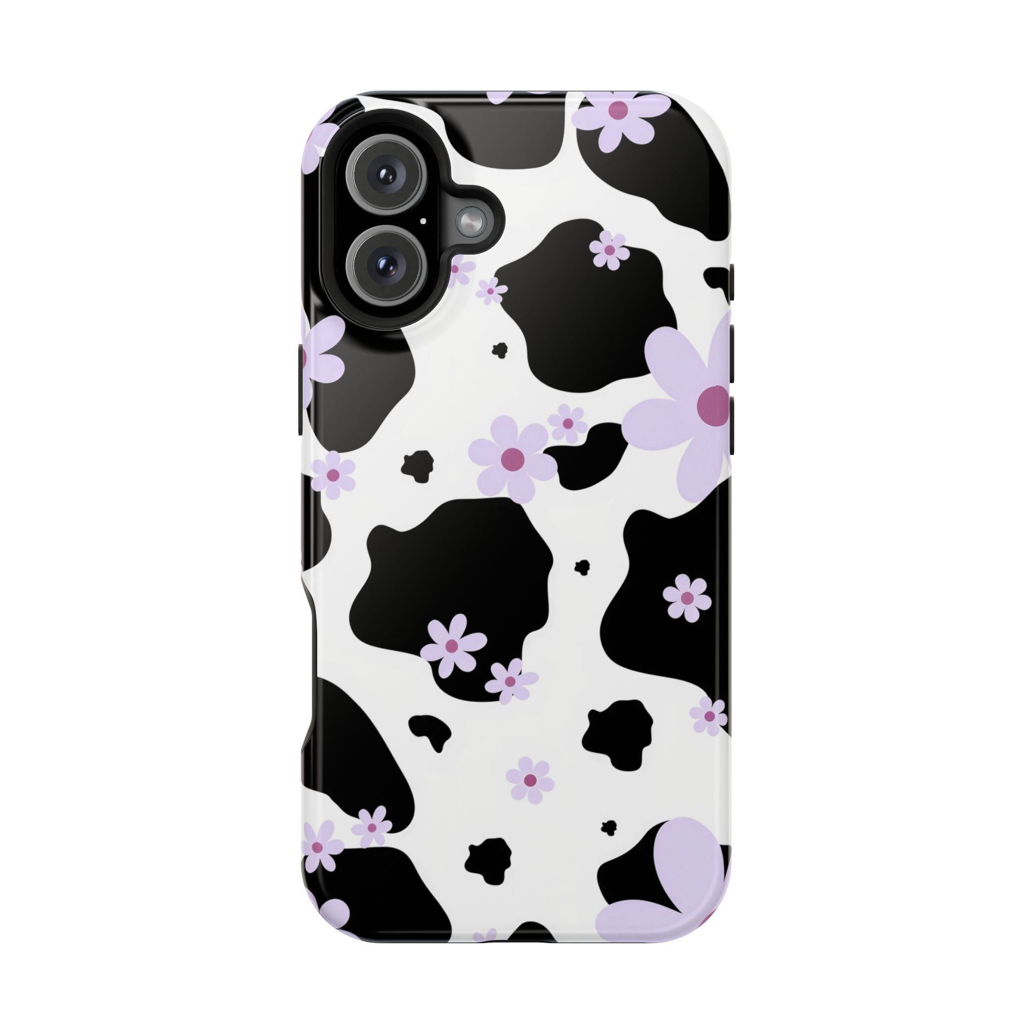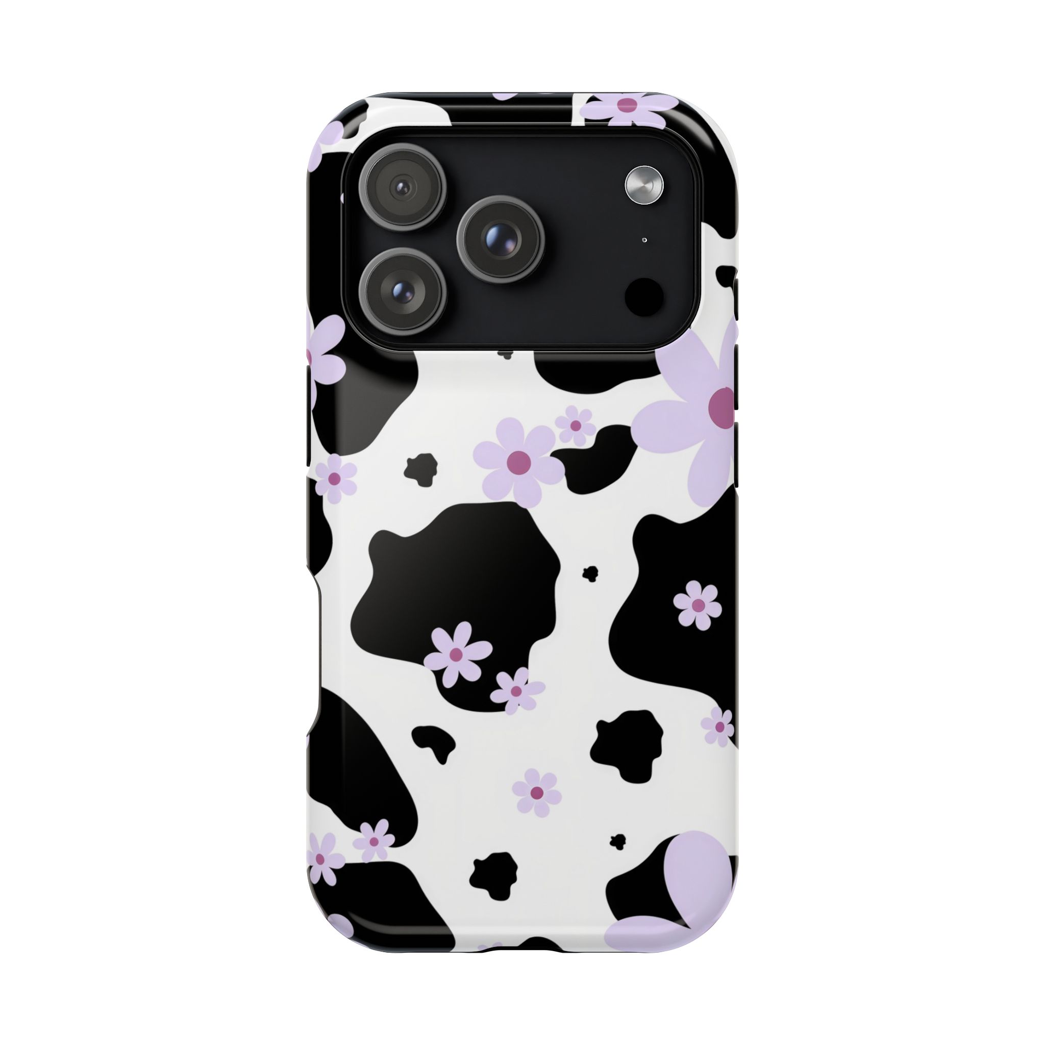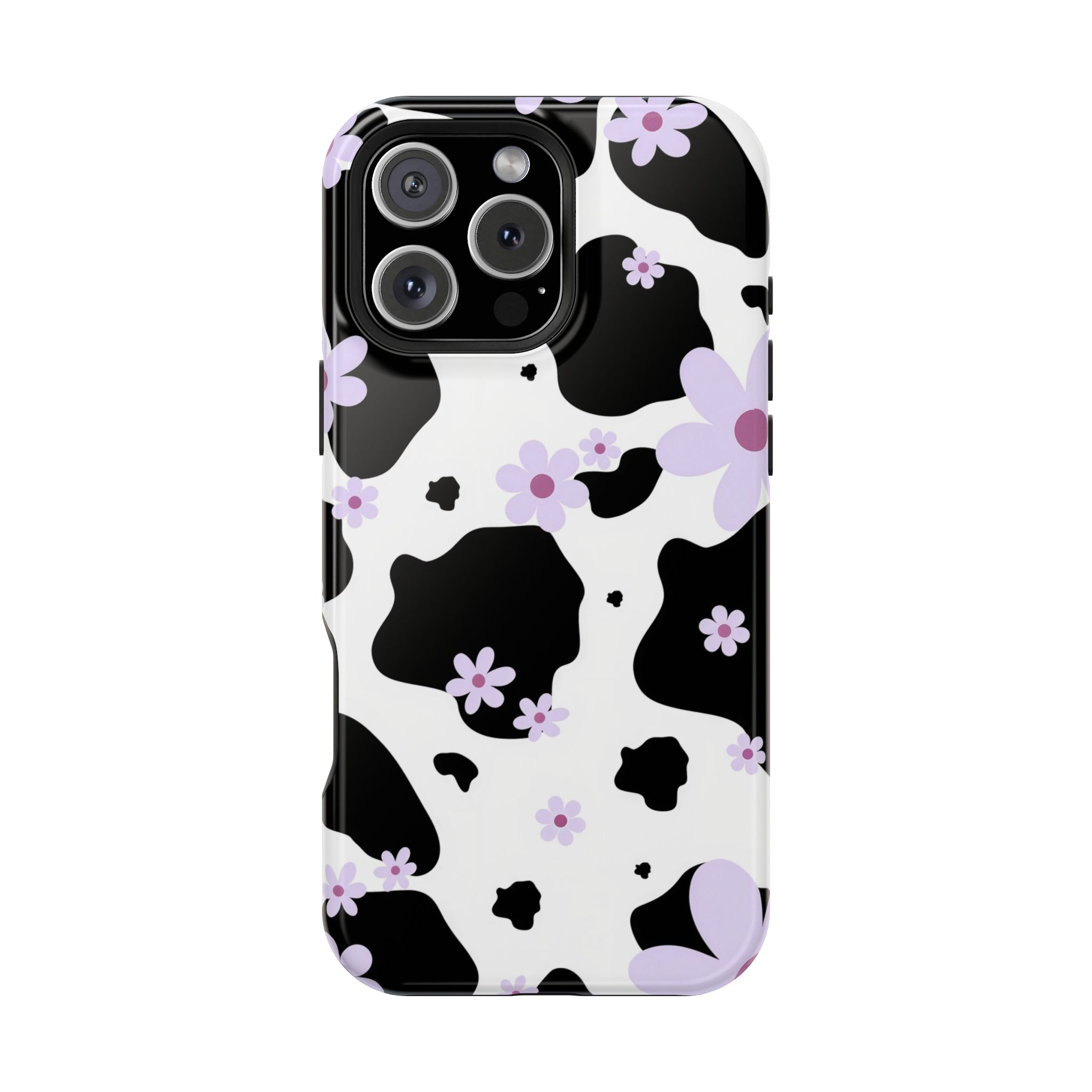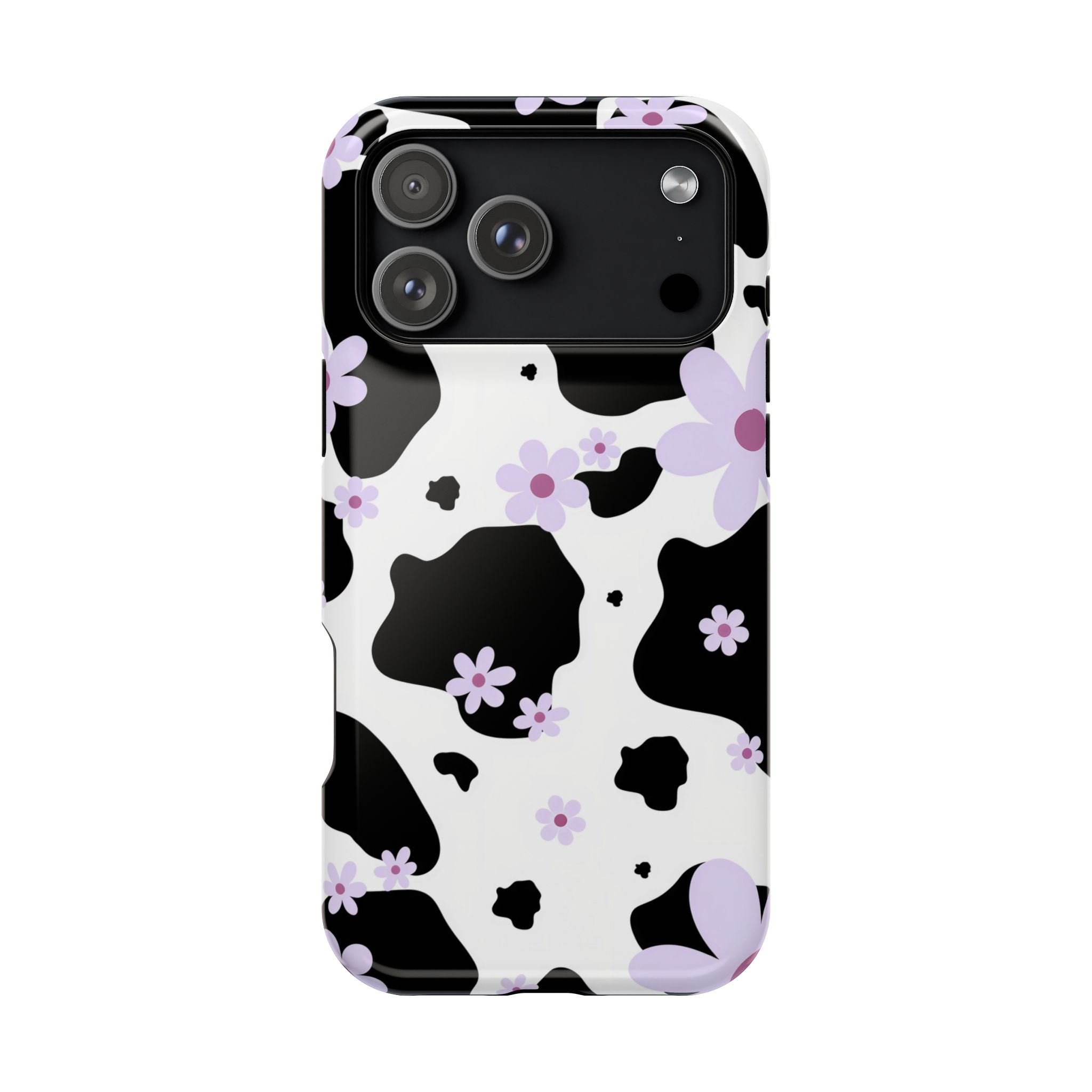 This unique design blends classic black-and-white cow patches with sweet lavender floral accents, giving it the perfect mix of trendy and cute.