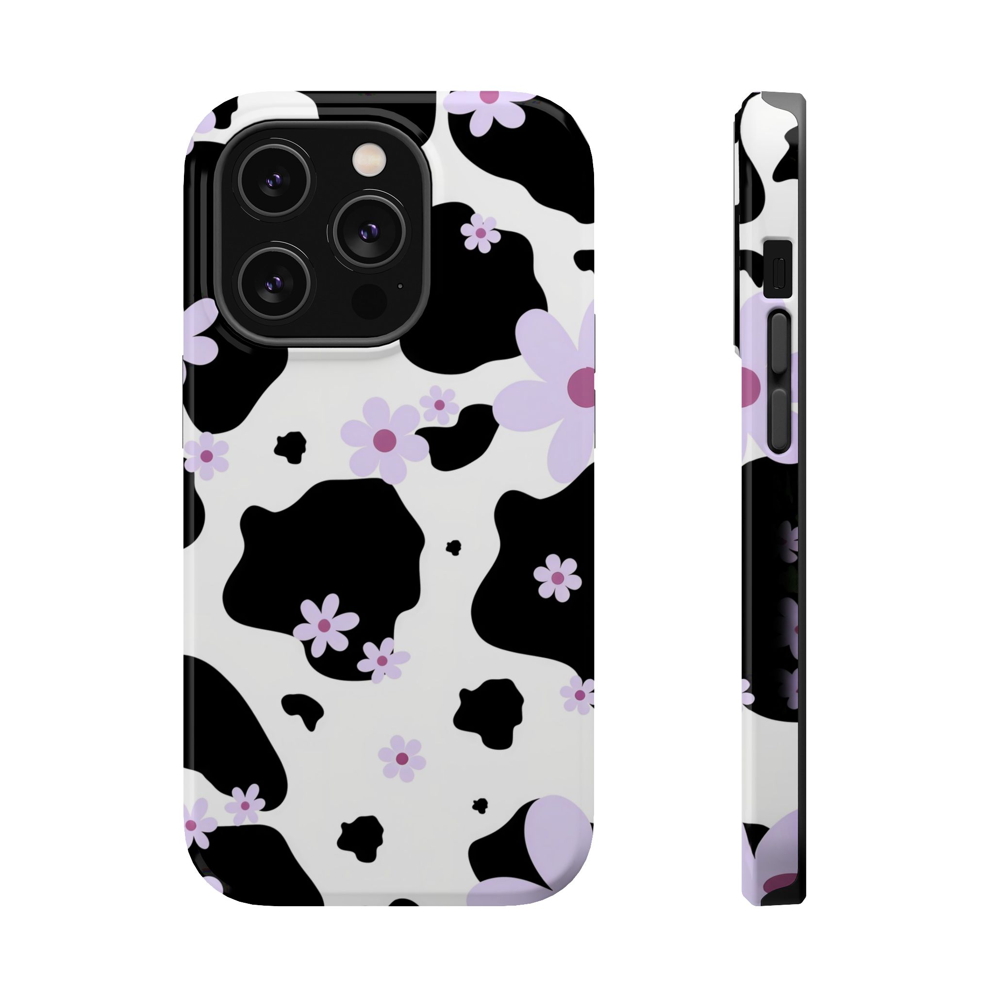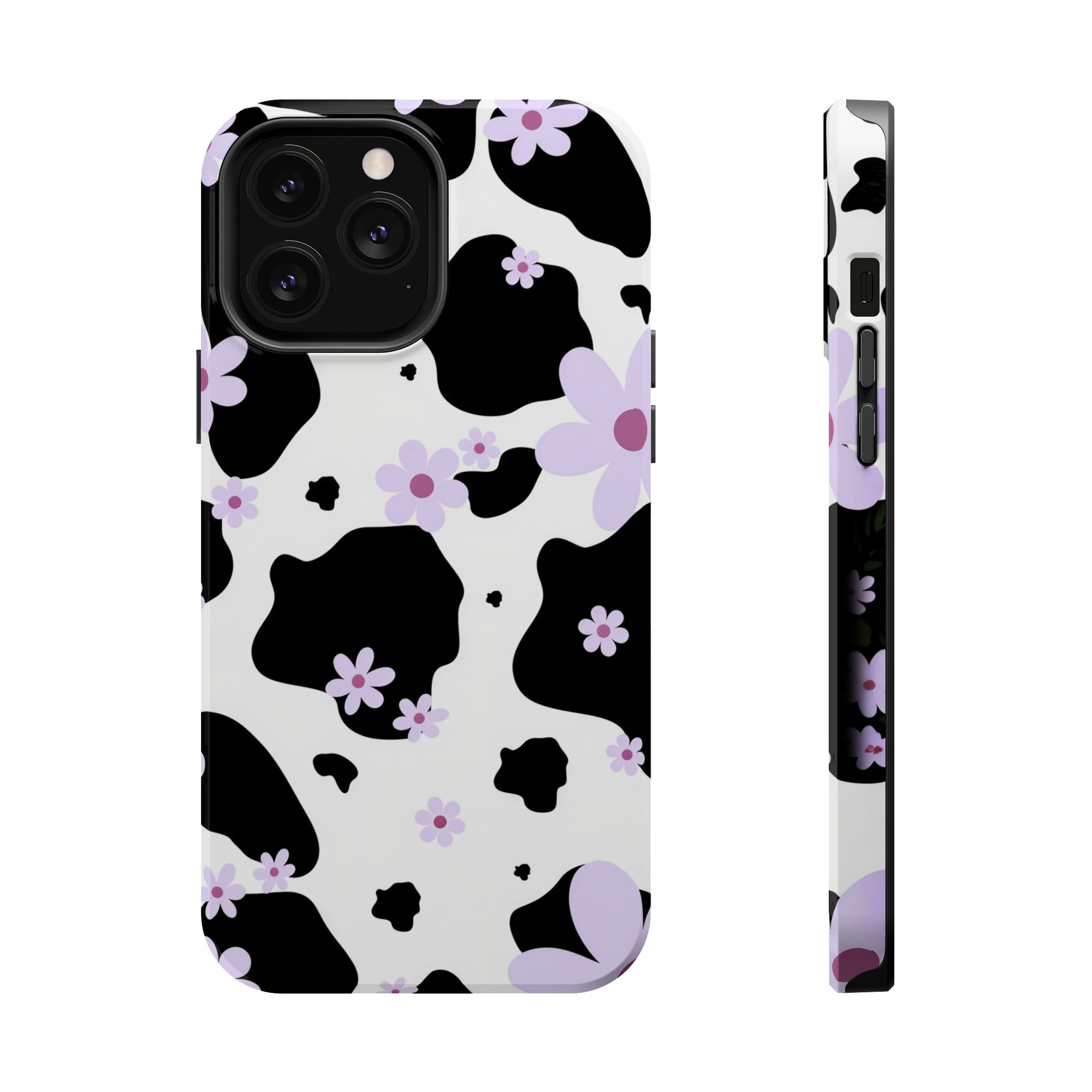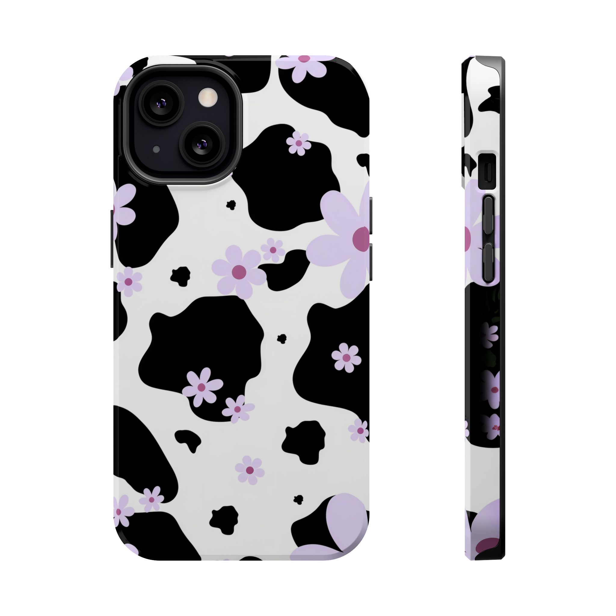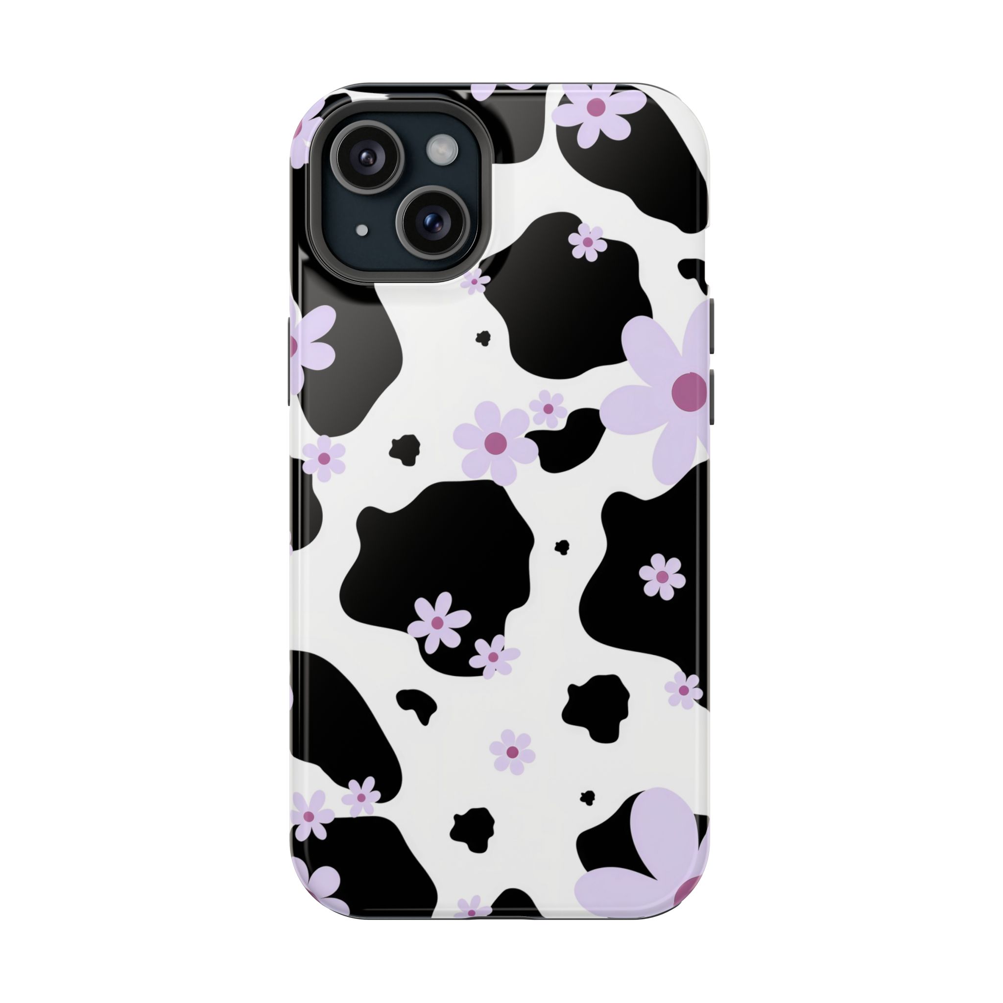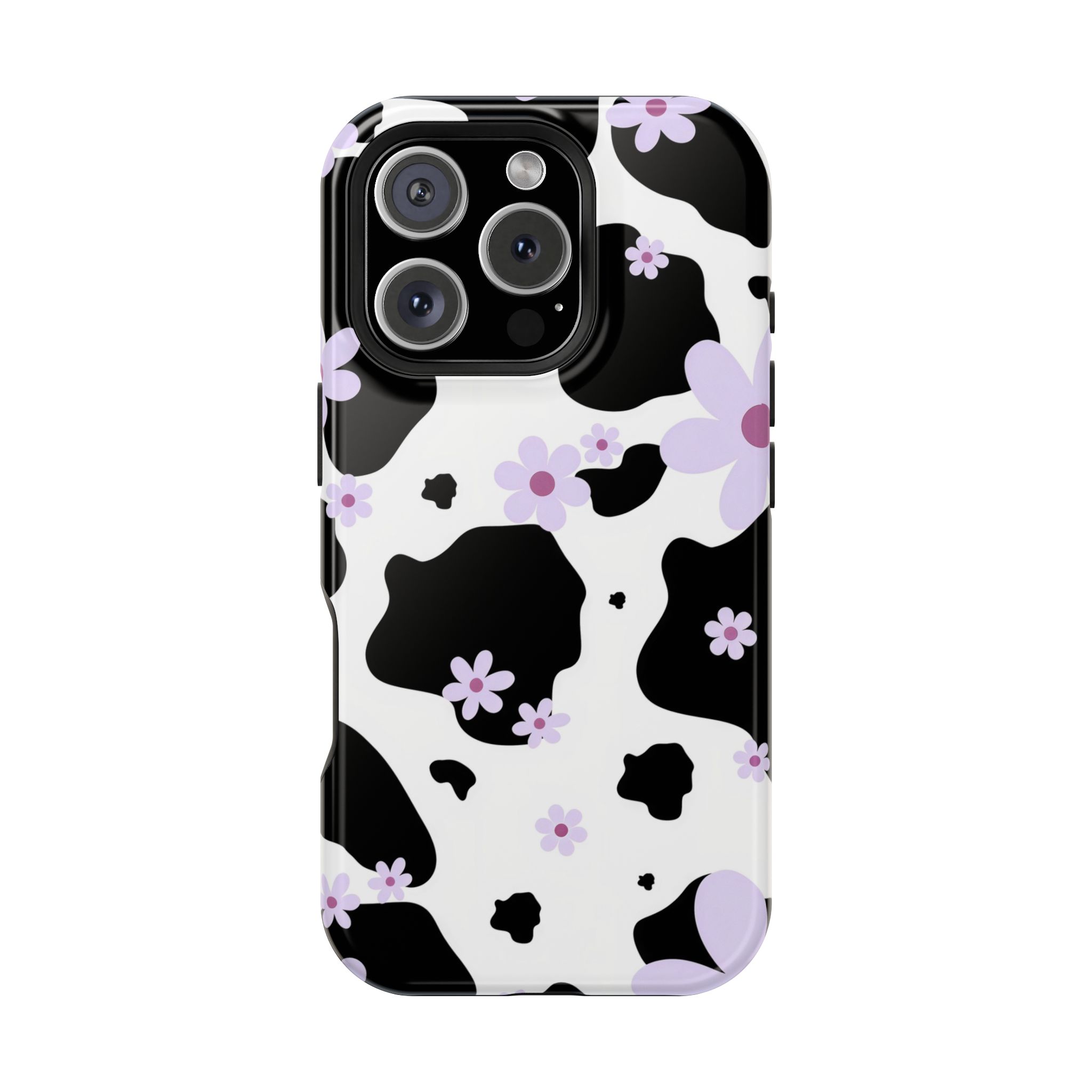 This unique design blends classic black-and-white cow patches with sweet lavender floral accents, giving it the perfect mix of trendy and cute.