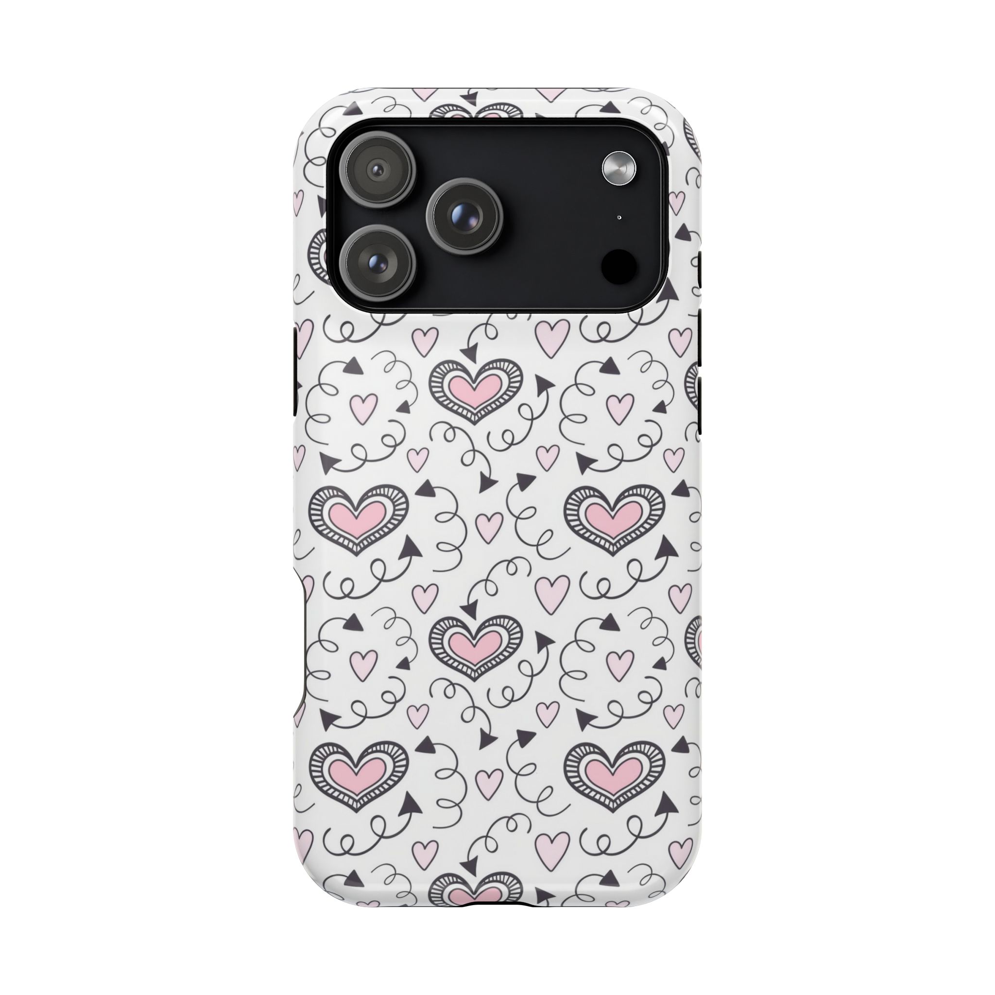Add a touch of romance and fun to your everyday style with this Pink Cupid Hearts Swirl Pattern phone case. Set against a clean white background, the design features soft pink hearts framed by decorative black outlines, playful arrow accents, and swirling hand-drawn loops that give it a lively, sketch-style charm.