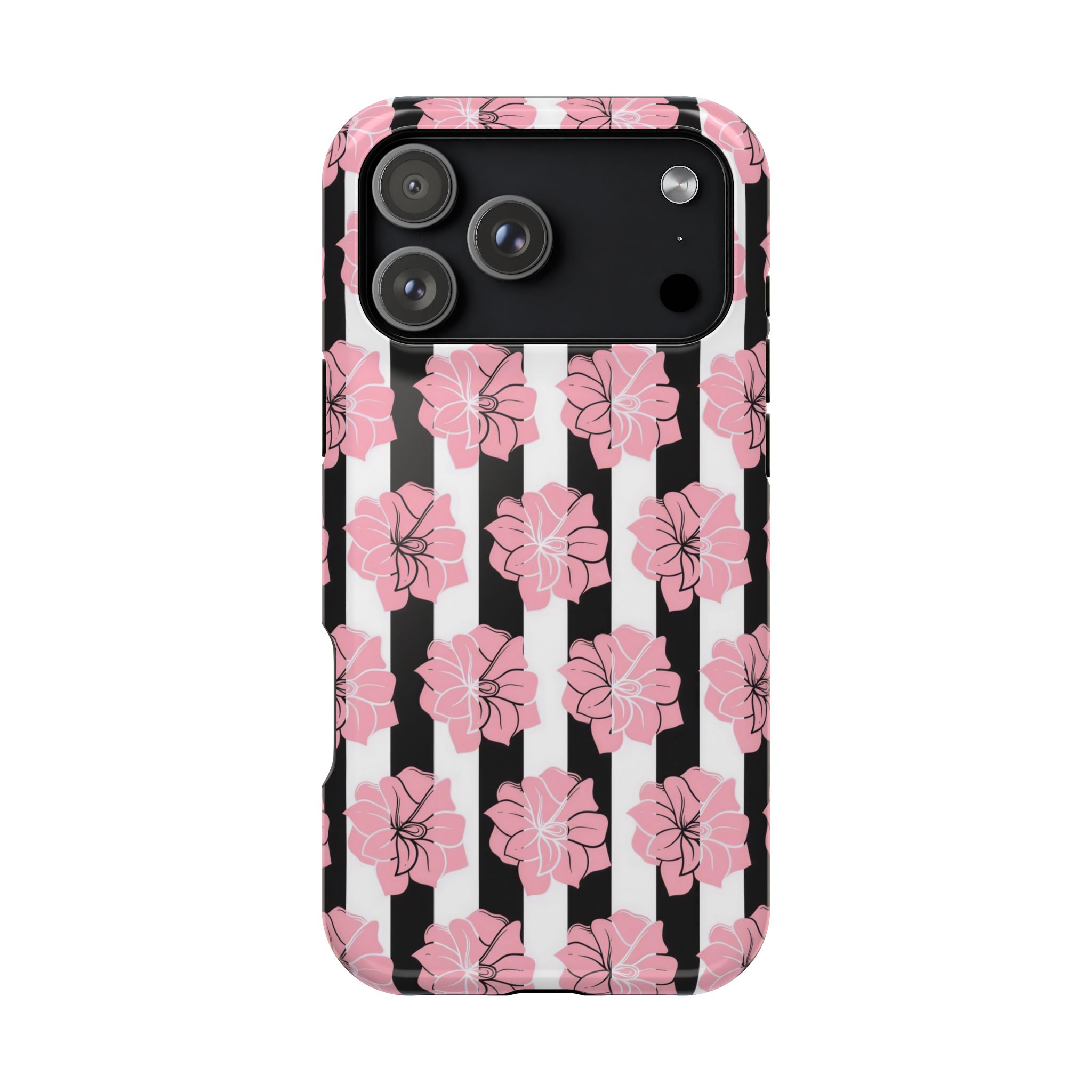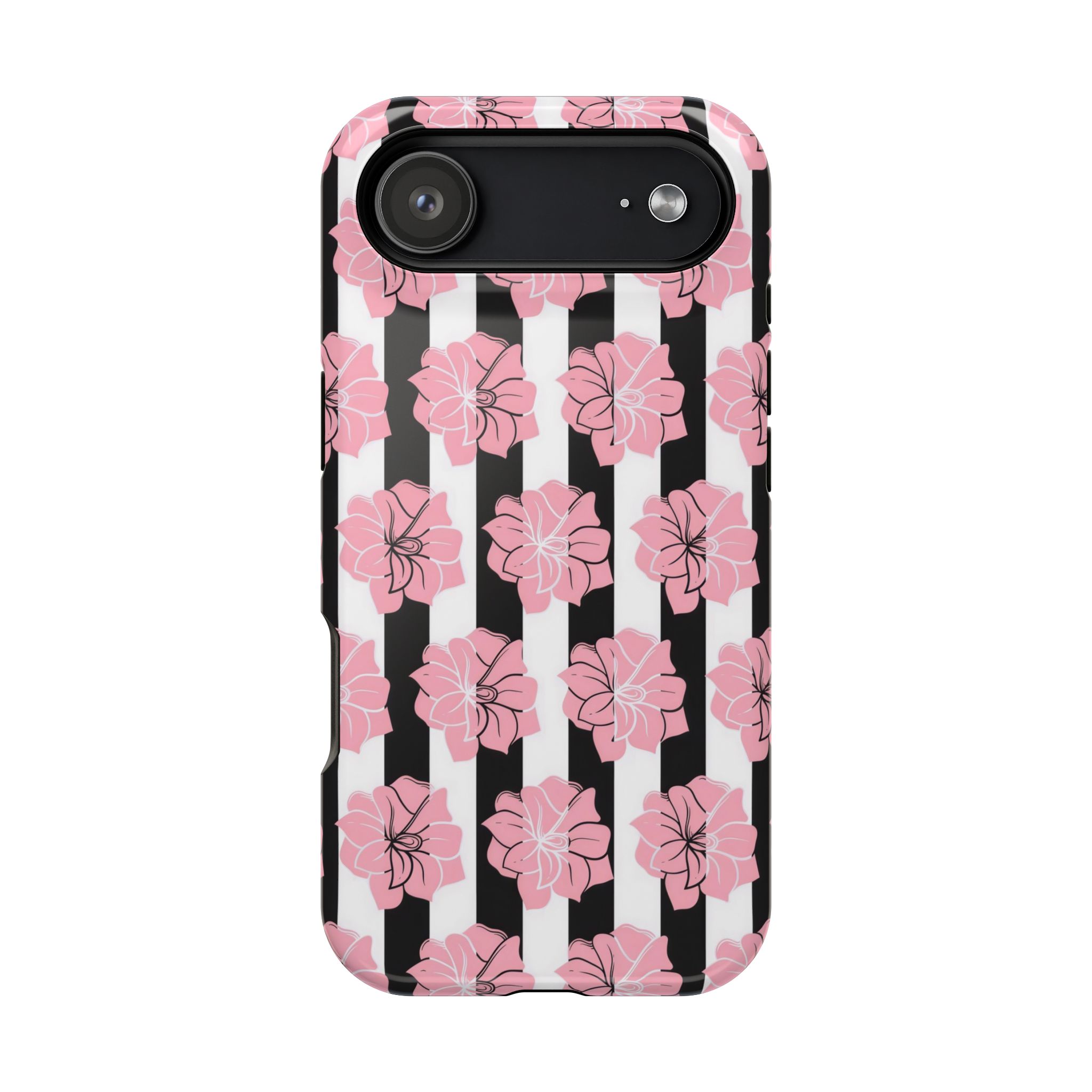 A chic Pink Floral Stripe Case featuring bold black-and-white stripes paired with soft pink illustrated flowers. Stylish, modern, and perfect for users who love floral aesthetics with a fashionable twist.
