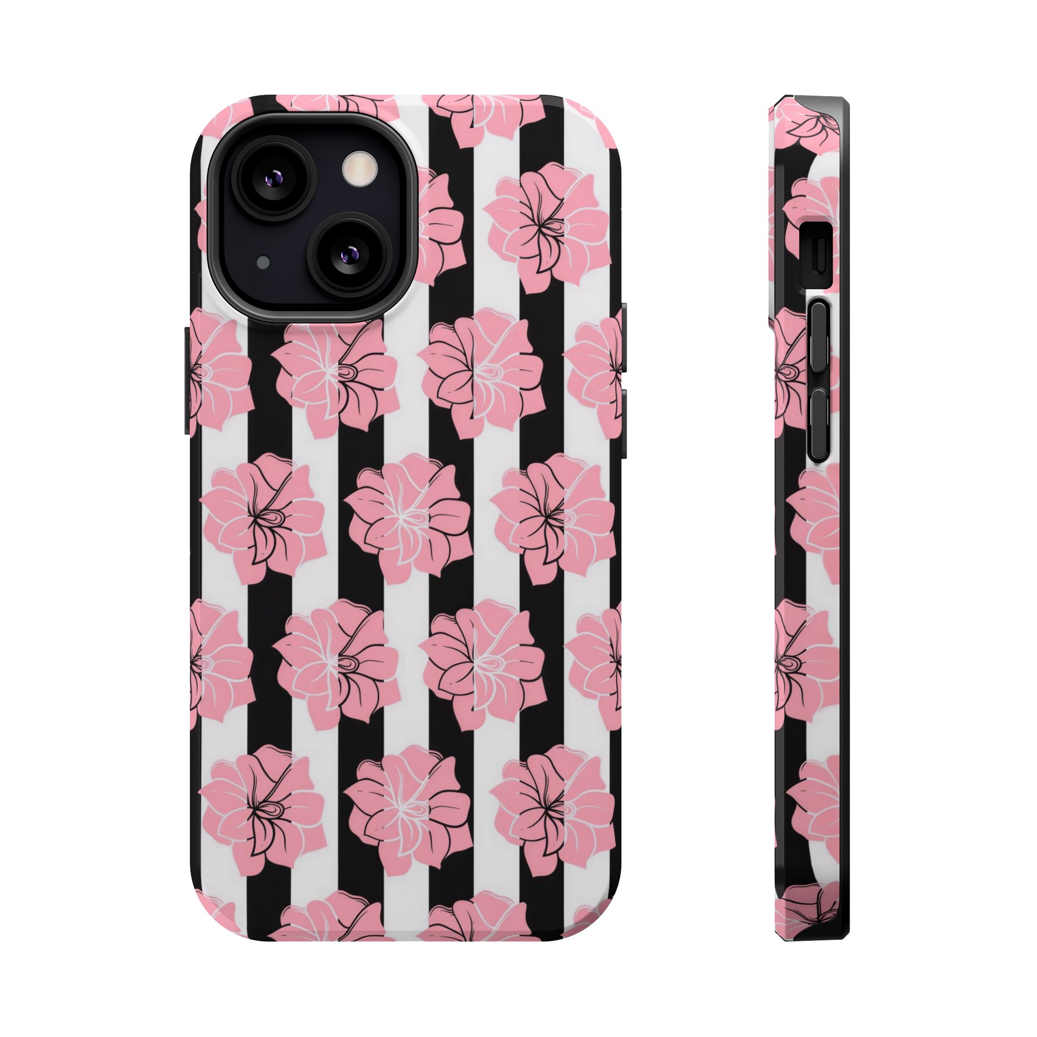The Pink Floral Stripe Case blends elegance with bold visual contrast. Designed with alternating black and white vertical stripes, this case highlights soft pink floral illustrations that add a touch of femininity and charm. Perfect for those who love modern floral aesthetics, the design balances minimalism with artistic detail.