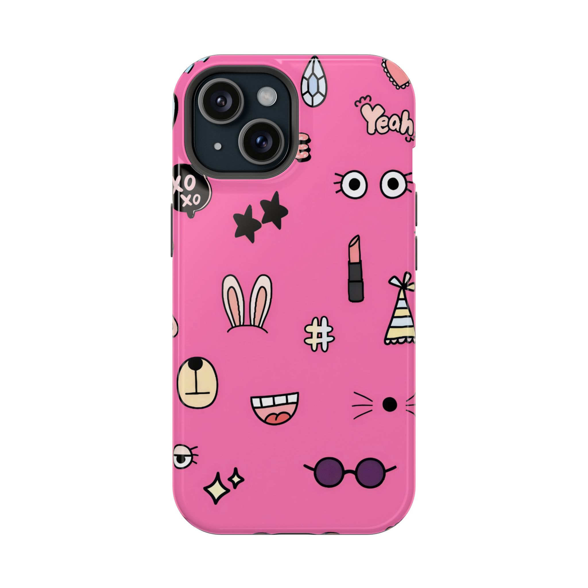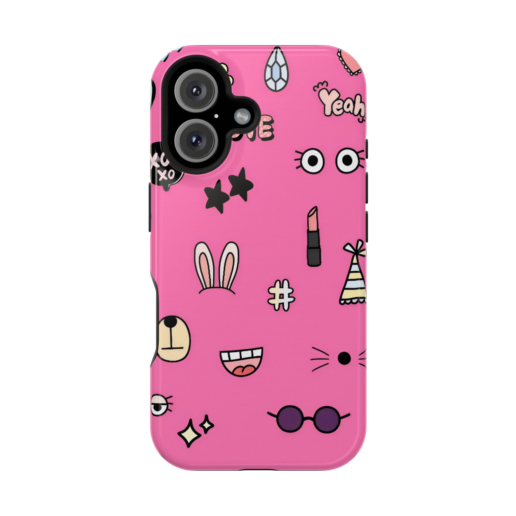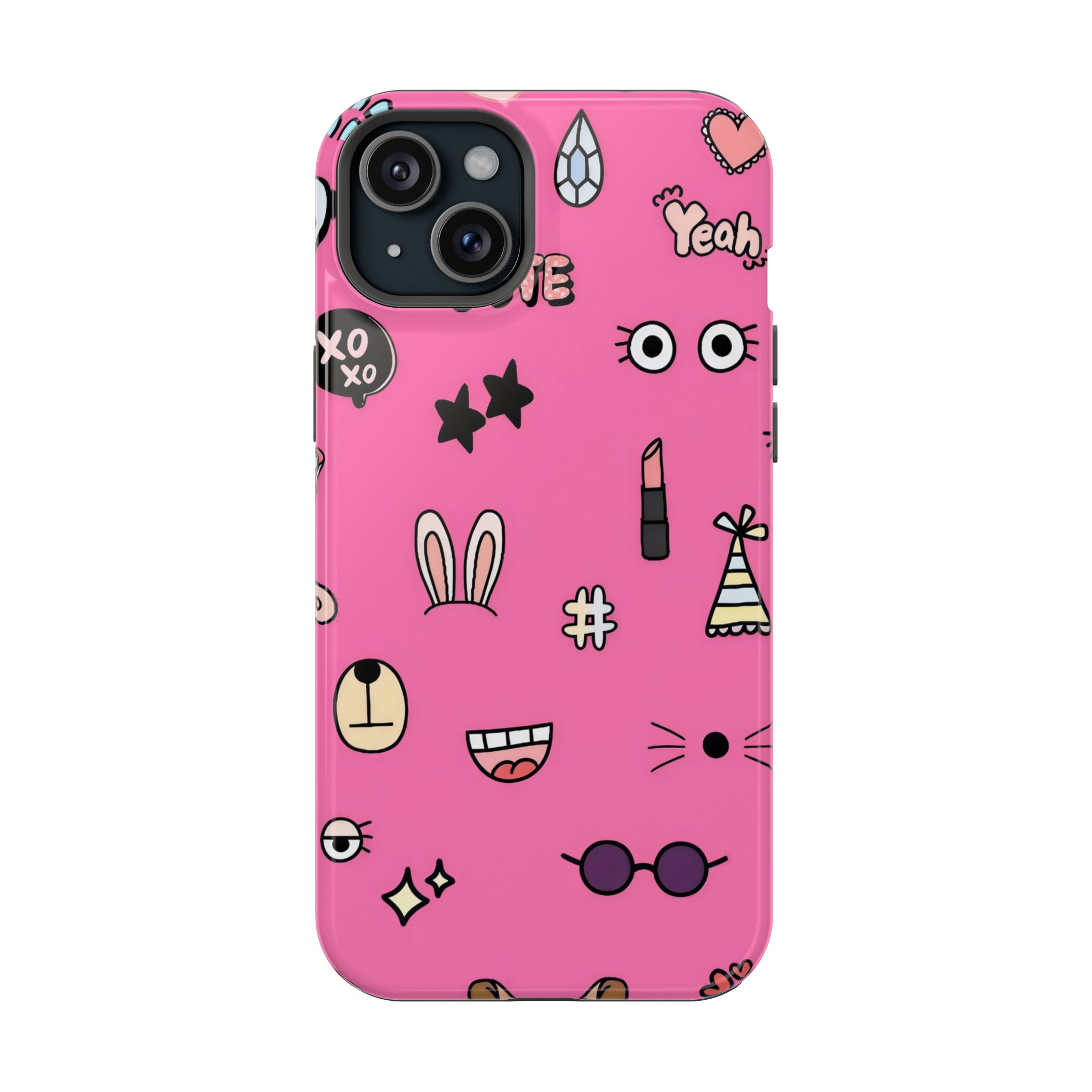 A playful pink doodle phone case featuring quirky icons like bunny ears, glasses, stars, lipstick, and smiley faces. Fun, vibrant, and perfect for anyone who loves expressive aesthetic designs.