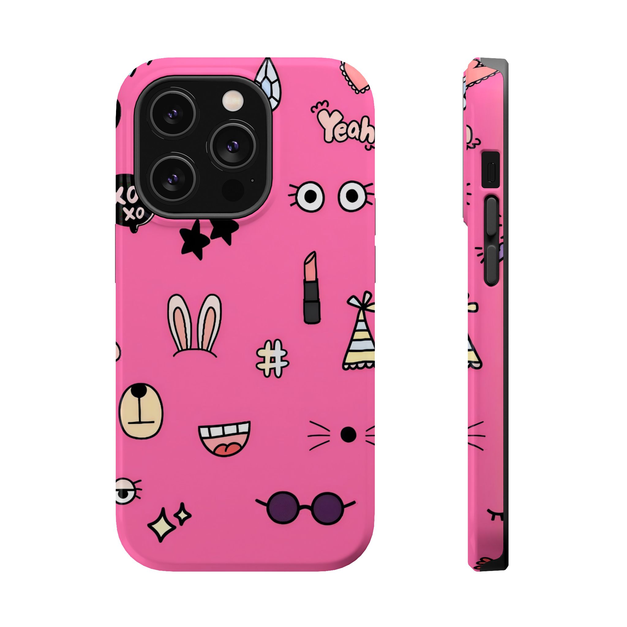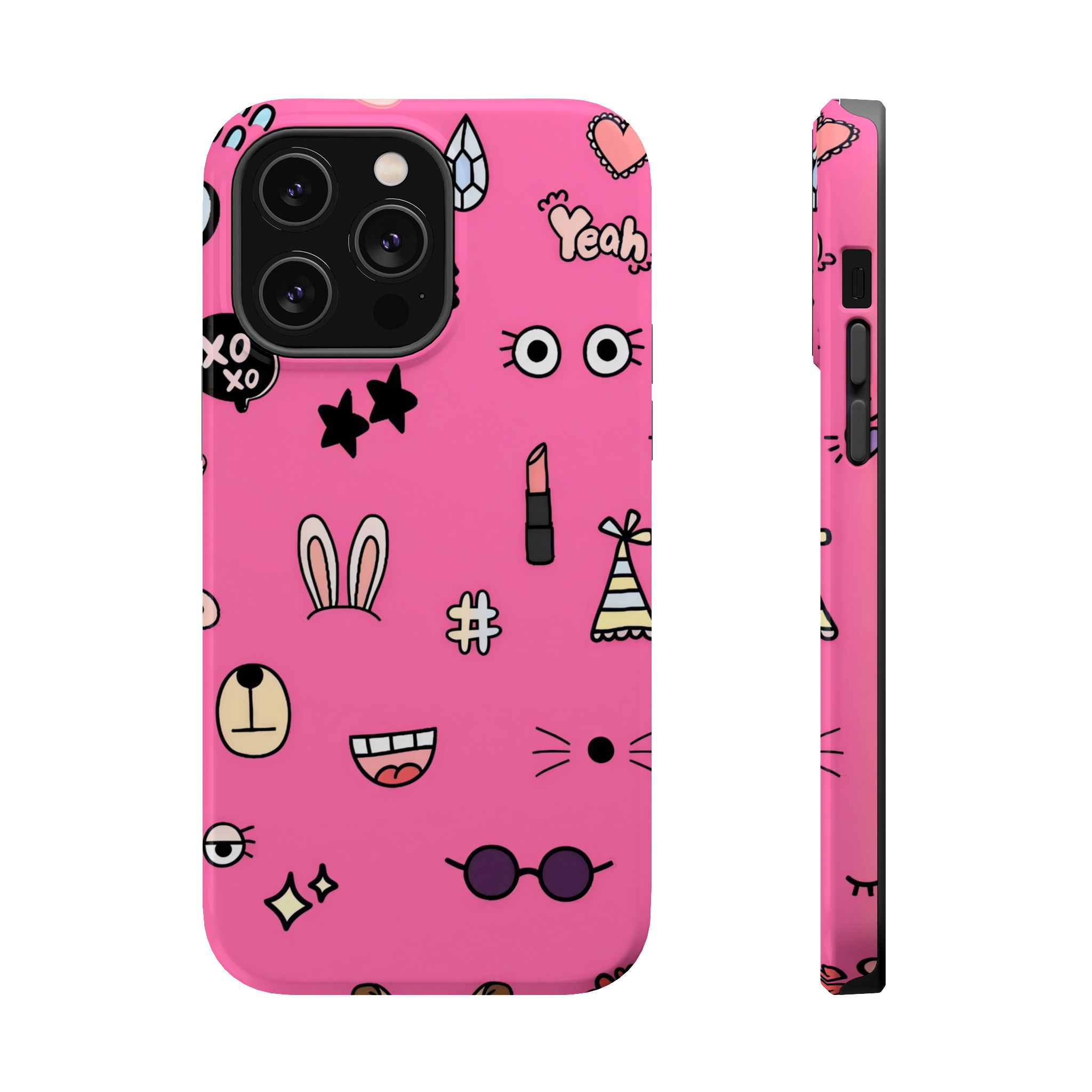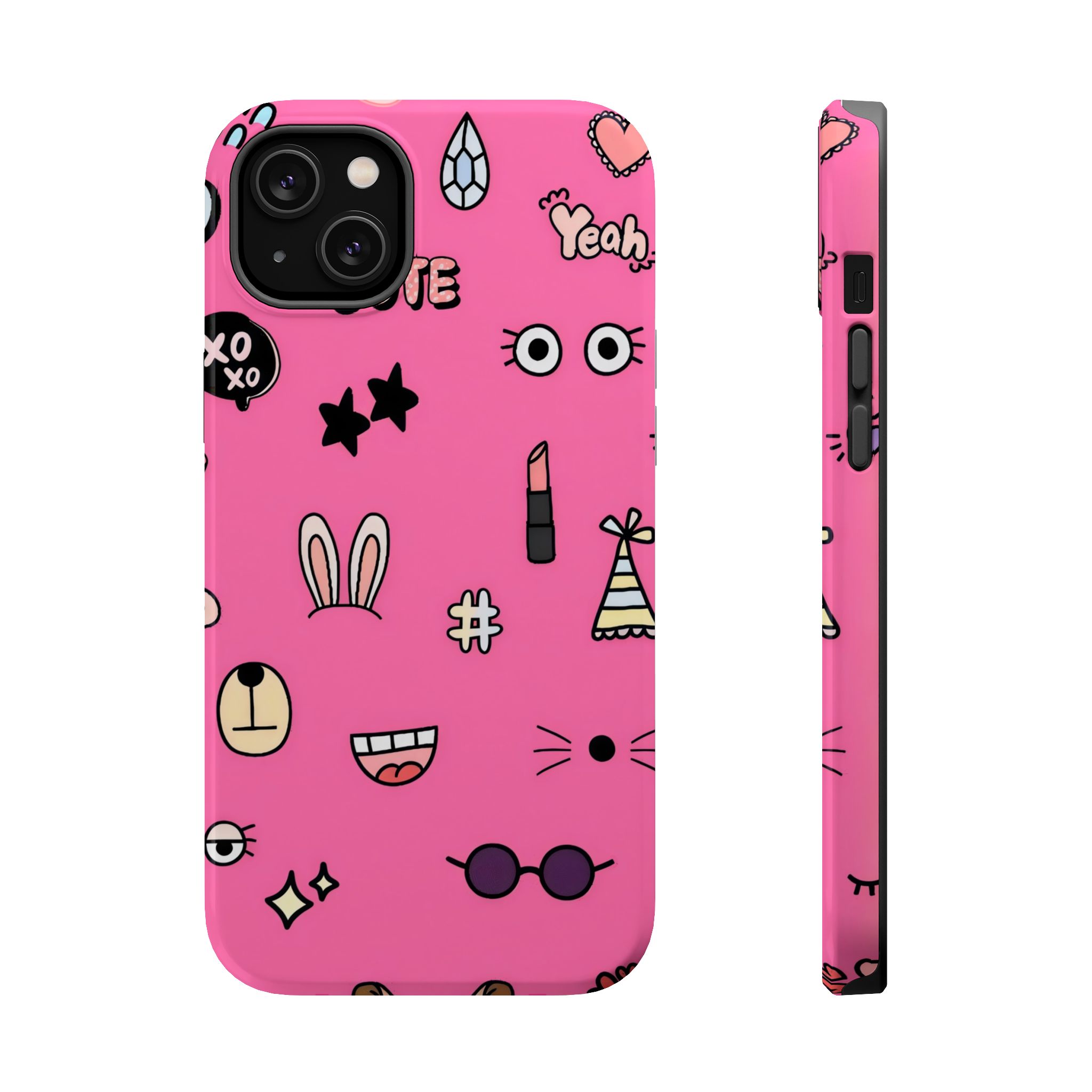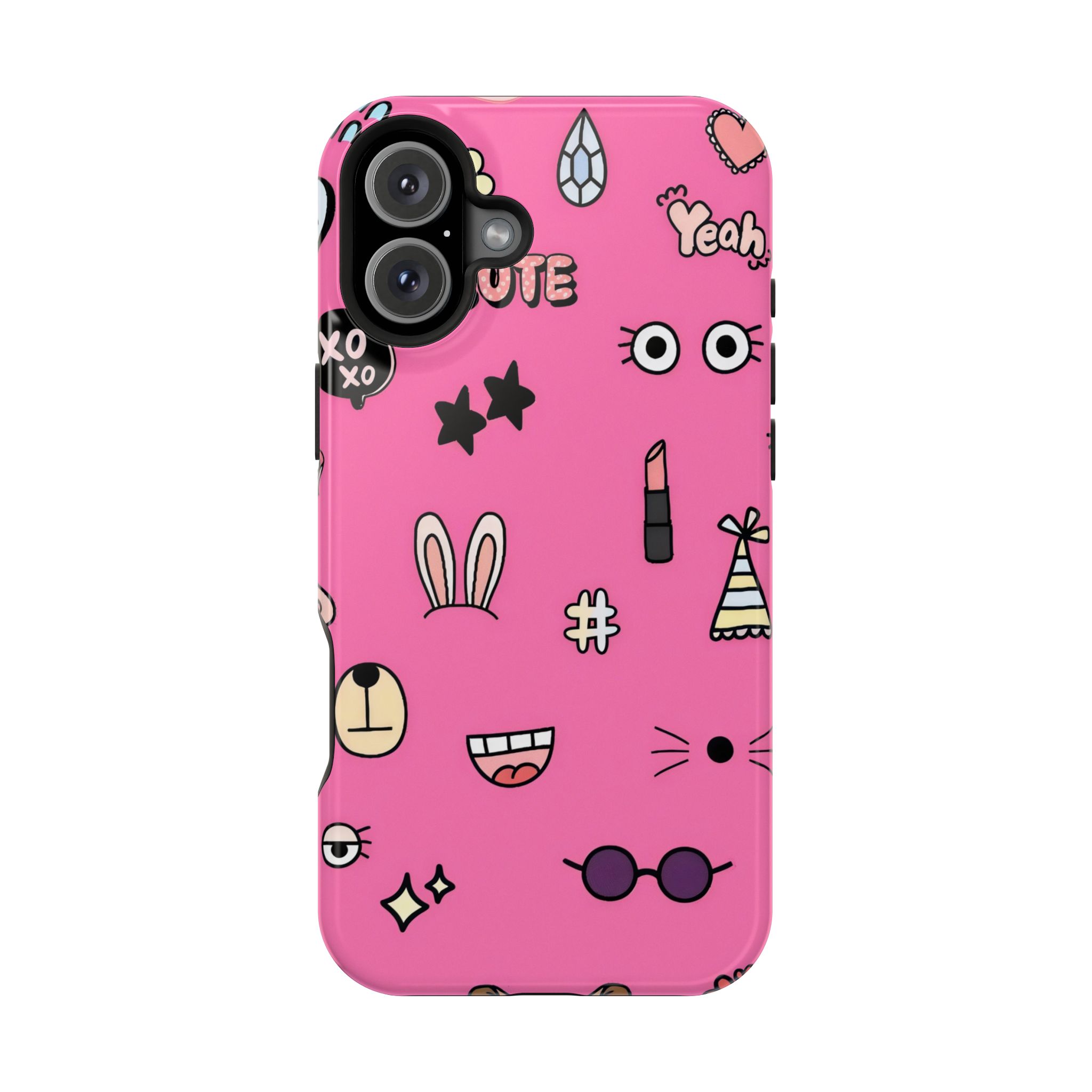 A playful pink doodle phone case featuring quirky icons like bunny ears, glasses, stars, lipstick, and smiley faces. Fun, vibrant, and perfect for anyone who loves expressive aesthetic designs.