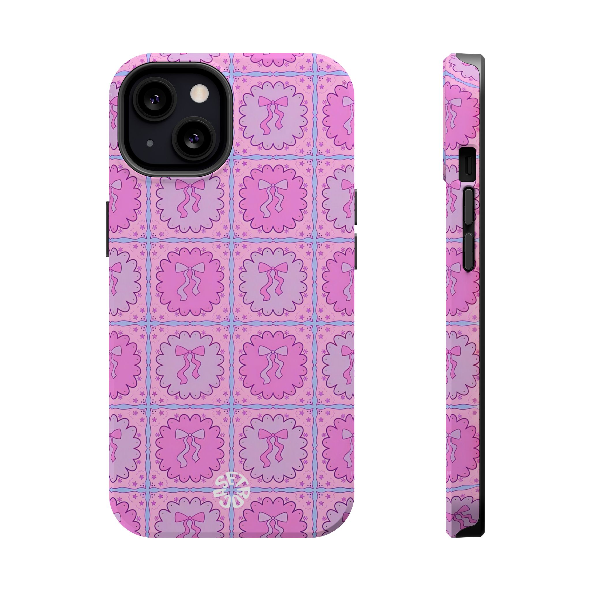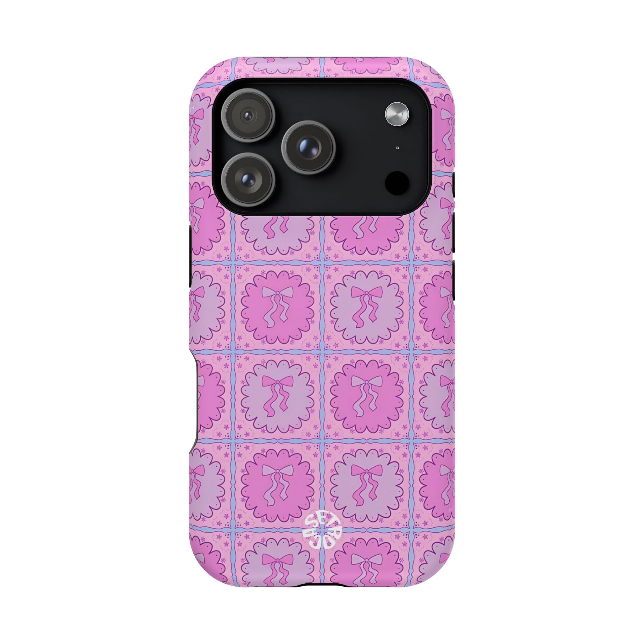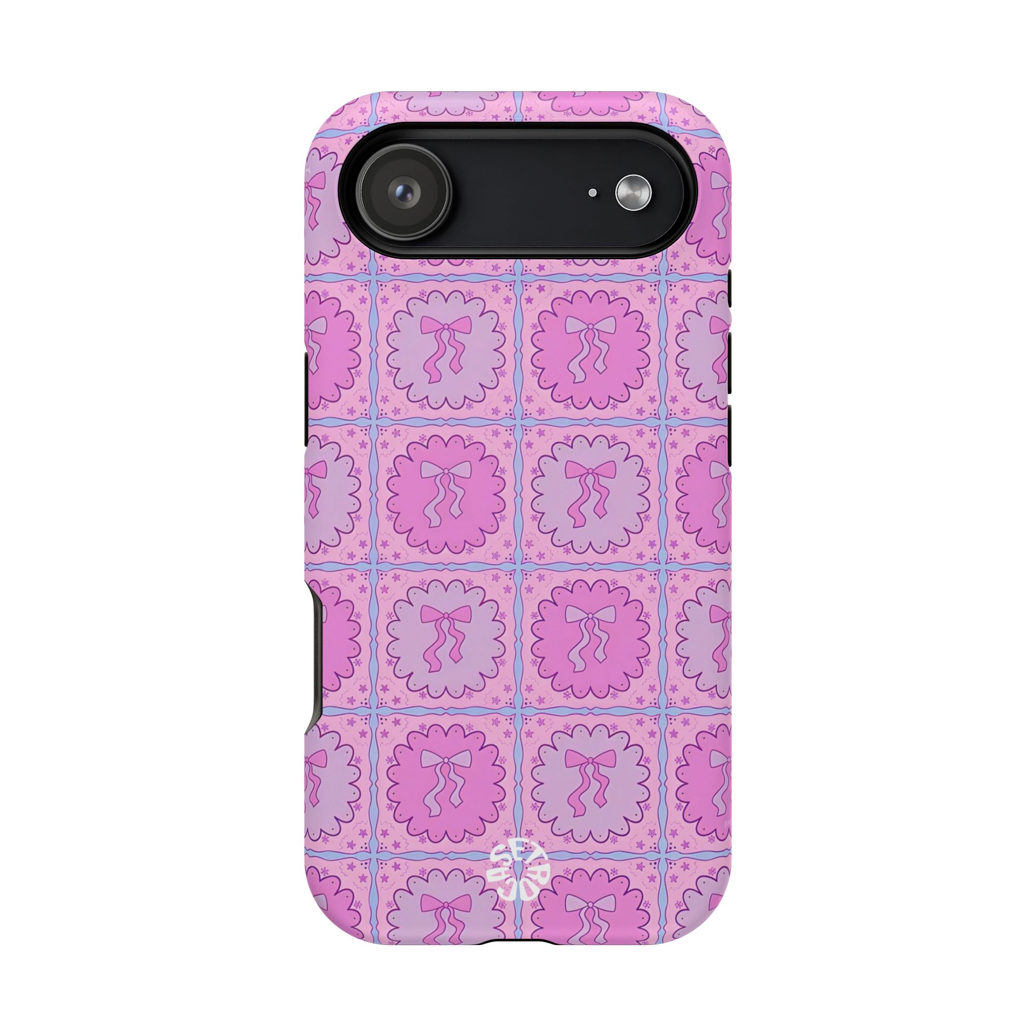 The Ruffle Ribbon case brings a dreamy pink bow phone case aesthetic to life with its pastel girly aesthetic pattern. Each tile features a delicate ruffled frame surrounding a minimal ribbon icon, arranged in a repeating pastel tile grid design of soft pinks and lavenders. The result is a cute, whimsical look that fits perfectly with soft girl accessories, kawaii bow motifs, and Y2K-inspired patterns.