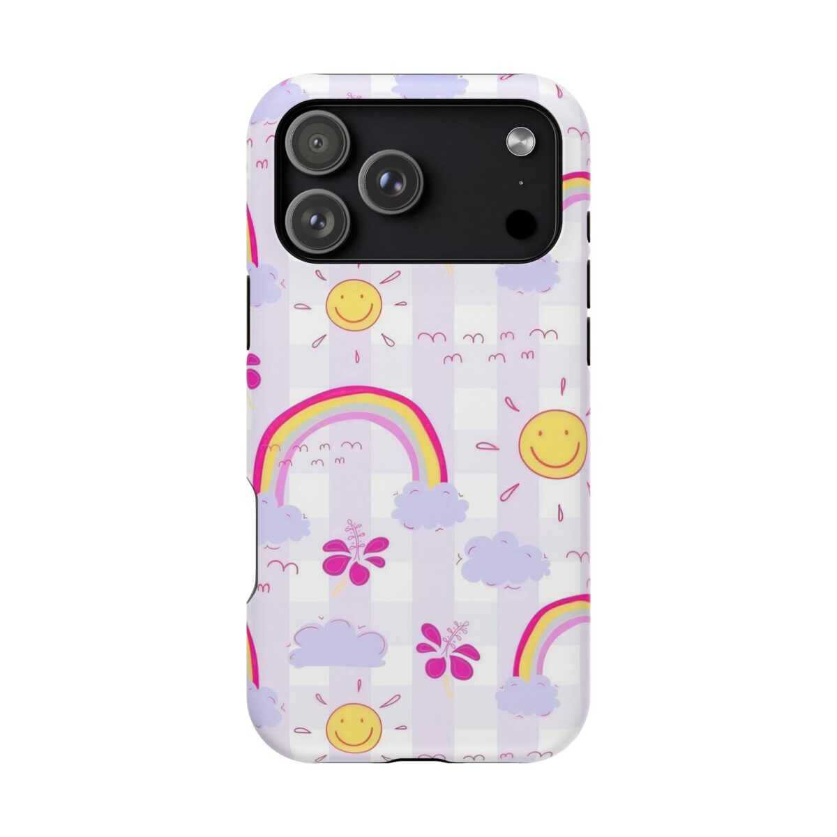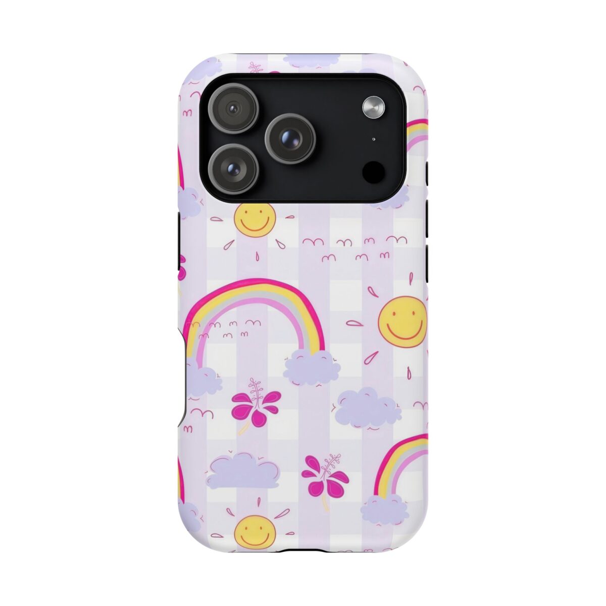 Add a pop of positivity to your phone with the Smiley Checkered Cute iPhone Case. This pastel-themed design blends cheerful smiley suns, rainbows, and clouds over a soft lavender checkered pattern for a playful yet aesthetic vibe. Built for everyday use, it offers strong MagSafe compatibility, reliable protection, and a smooth grip feel. Perfect for those who love cute and colorful designs that stand out without being loud.