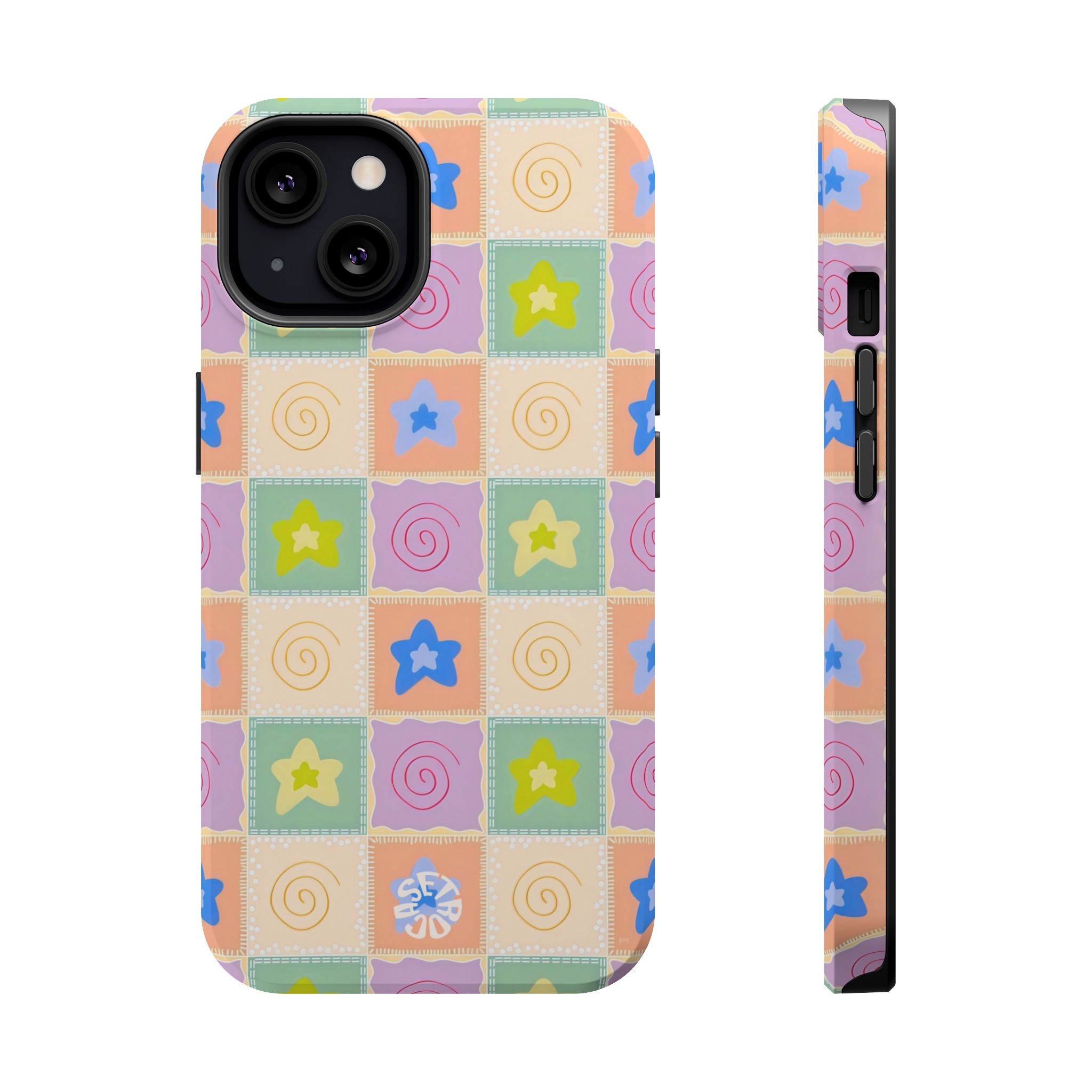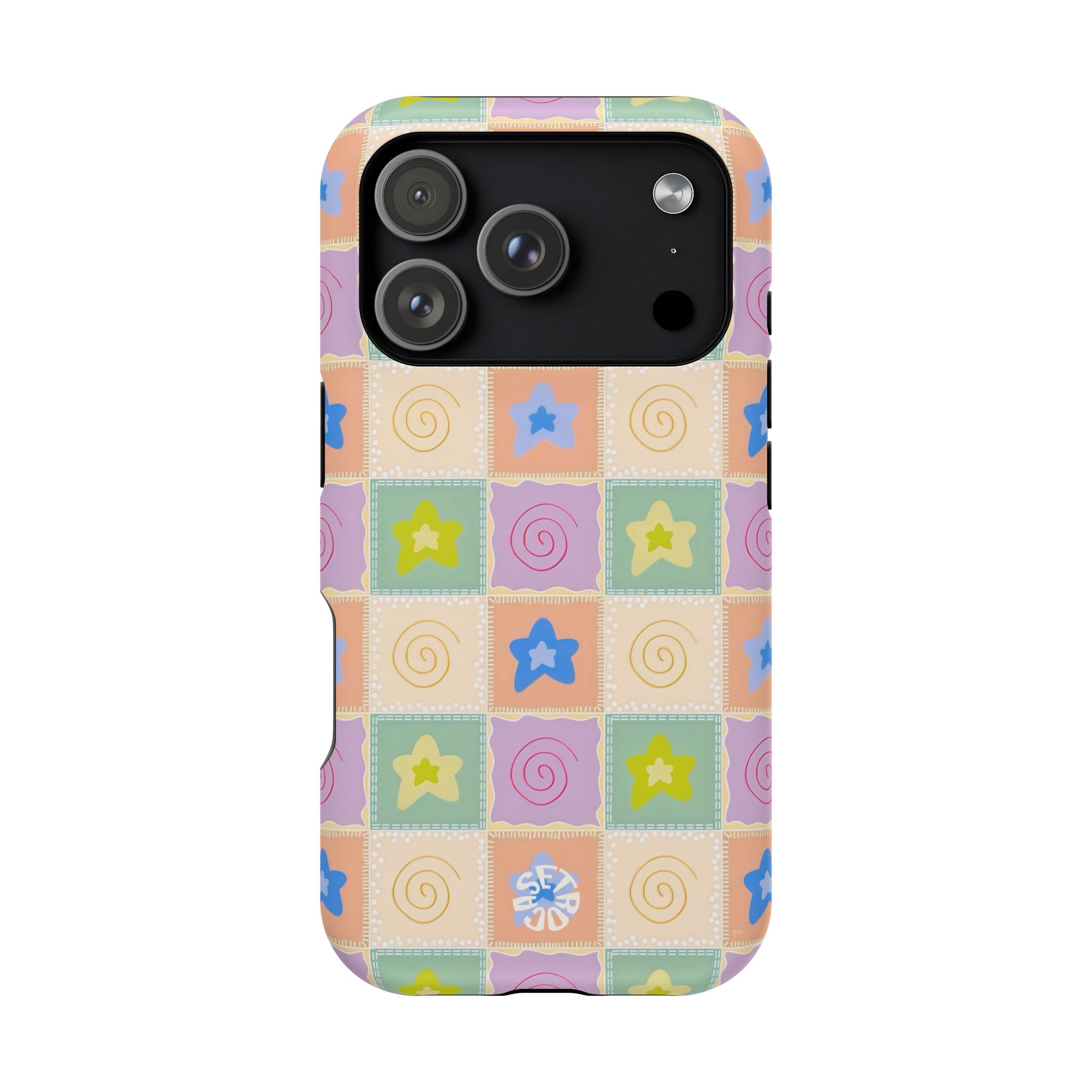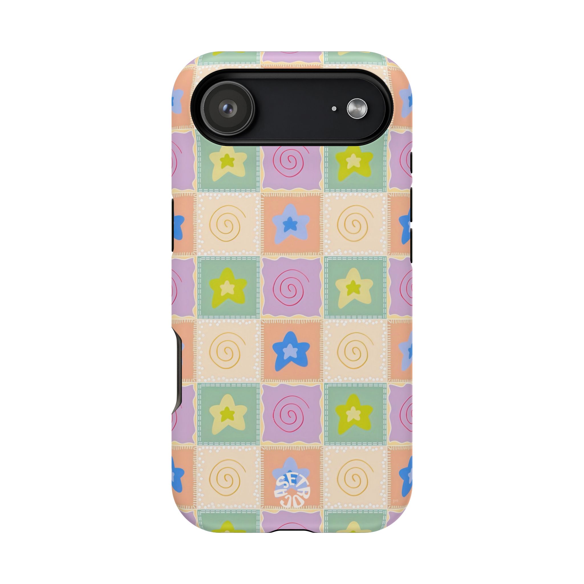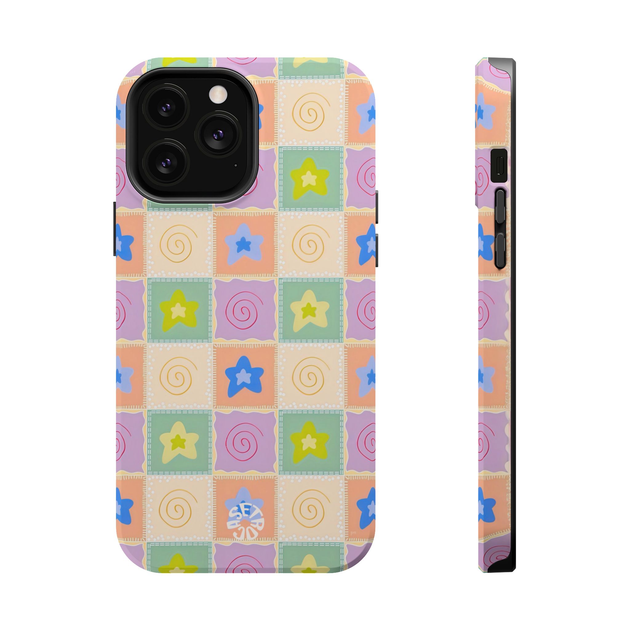 A pastel patchwork phone case with stars and swirls, quilt-style squares, dual-layer protection, matte anti-scratch finish, and cozy retro aesthetic.