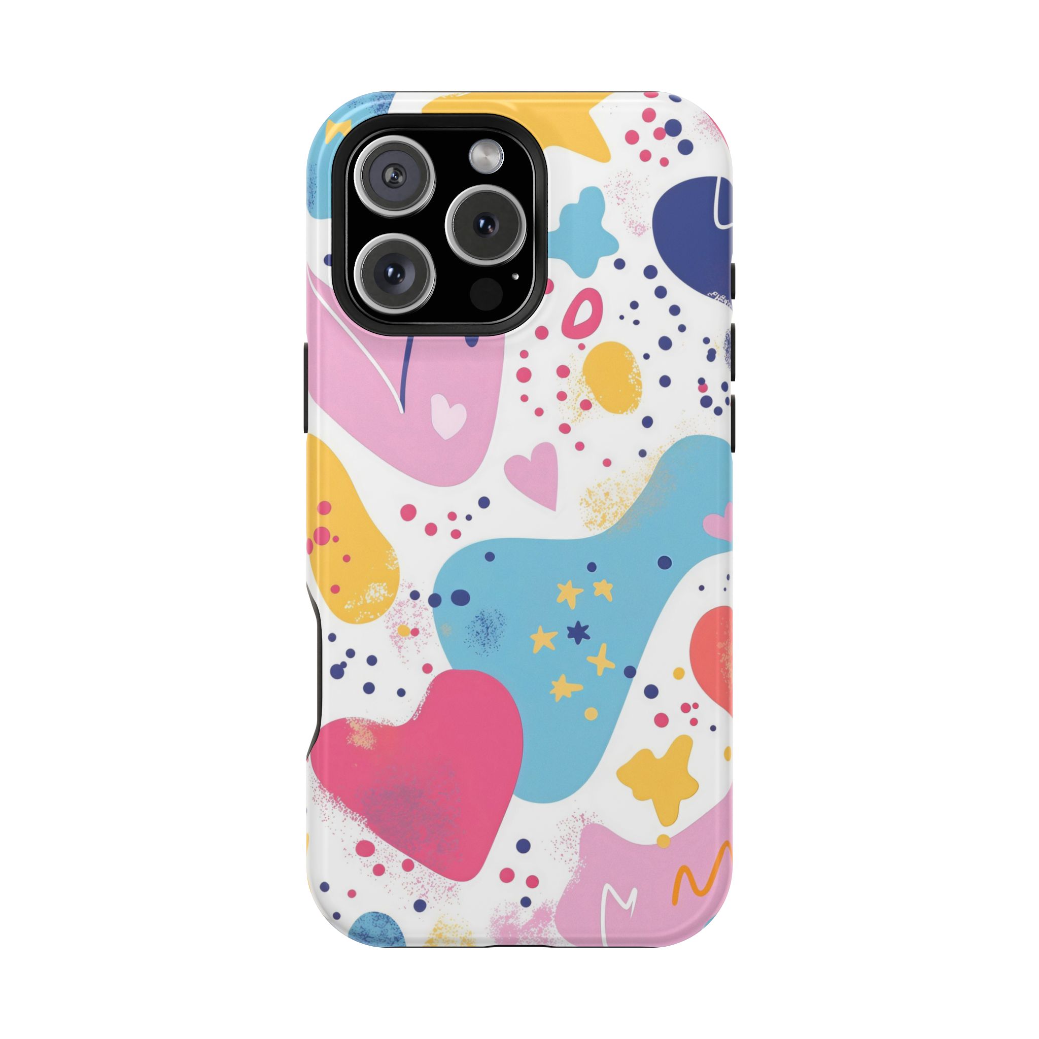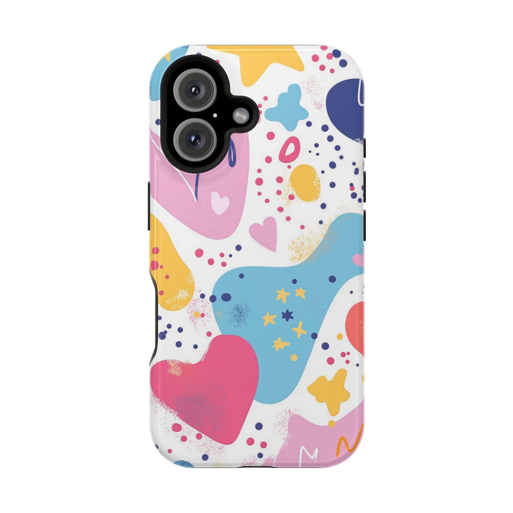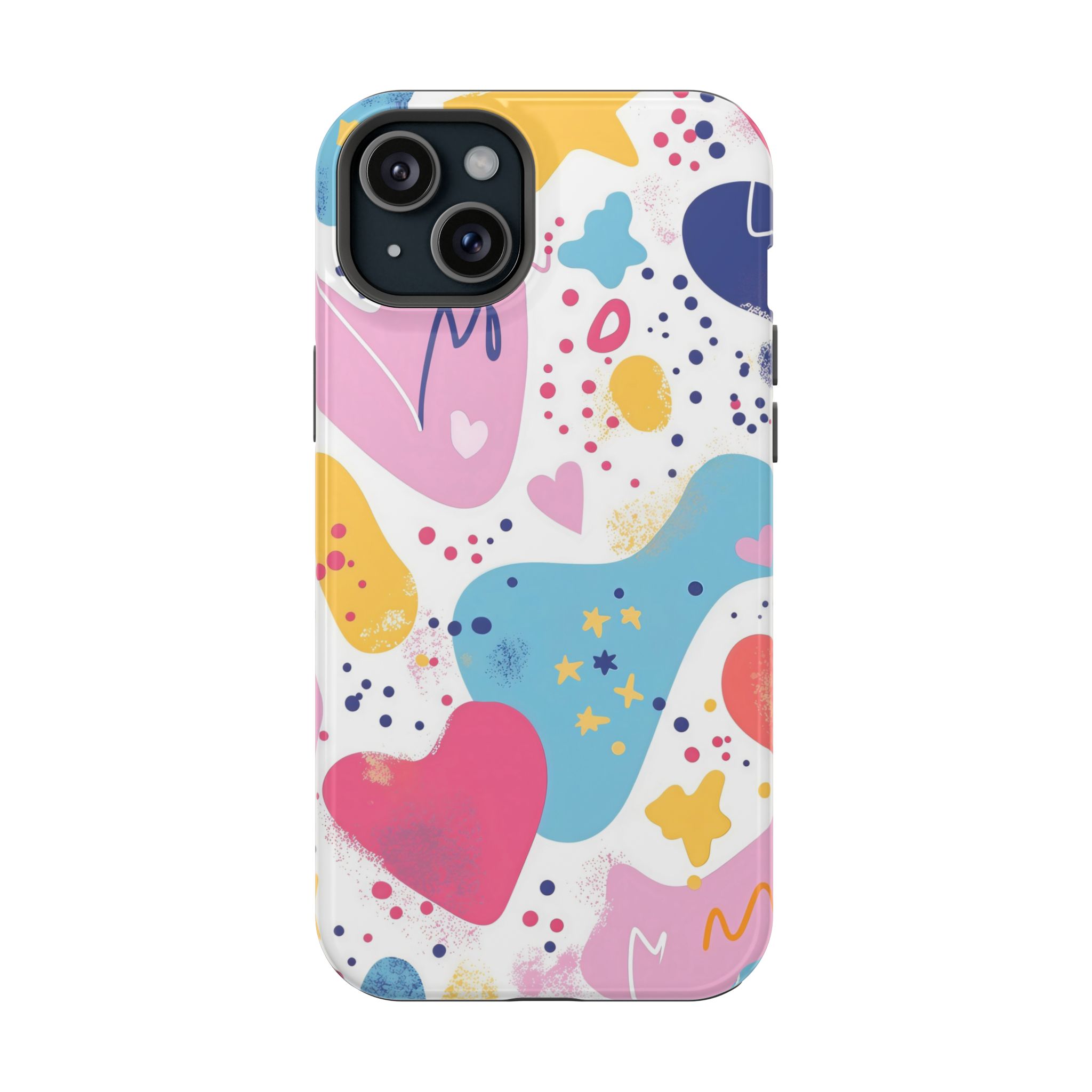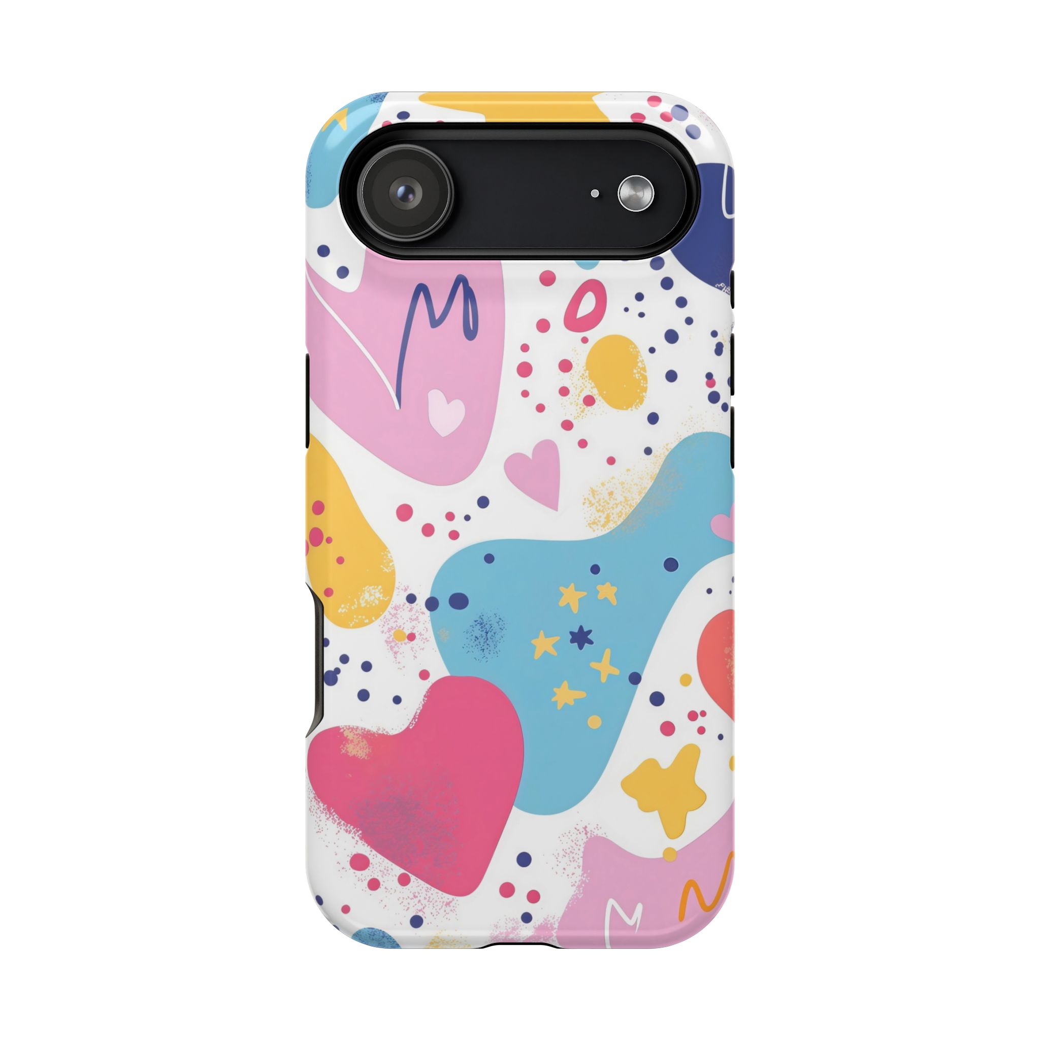 This Starry Hearts Color Splash Case brings a fun, expressive aesthetic to your iPhone with its vibrant mix of hearts, stars, and abstract shapes. The design features splashes of pink, yellow, blue, and purple, all blended into a cheerful pattern that feels artistic and youthful. Each shape has a soft, textured, hand-painted look, giving the case a doodle-inspired charm perfect for creative personalities.