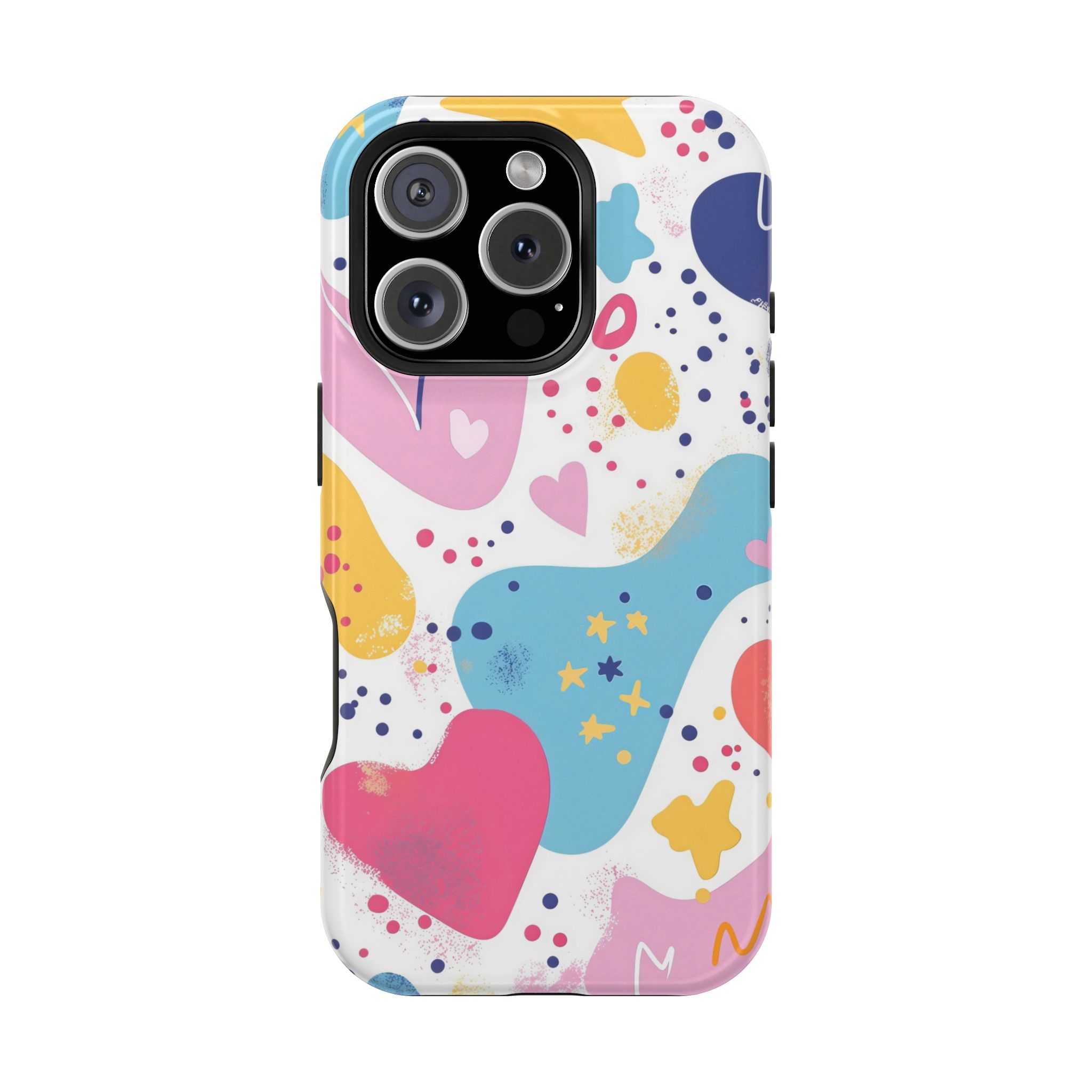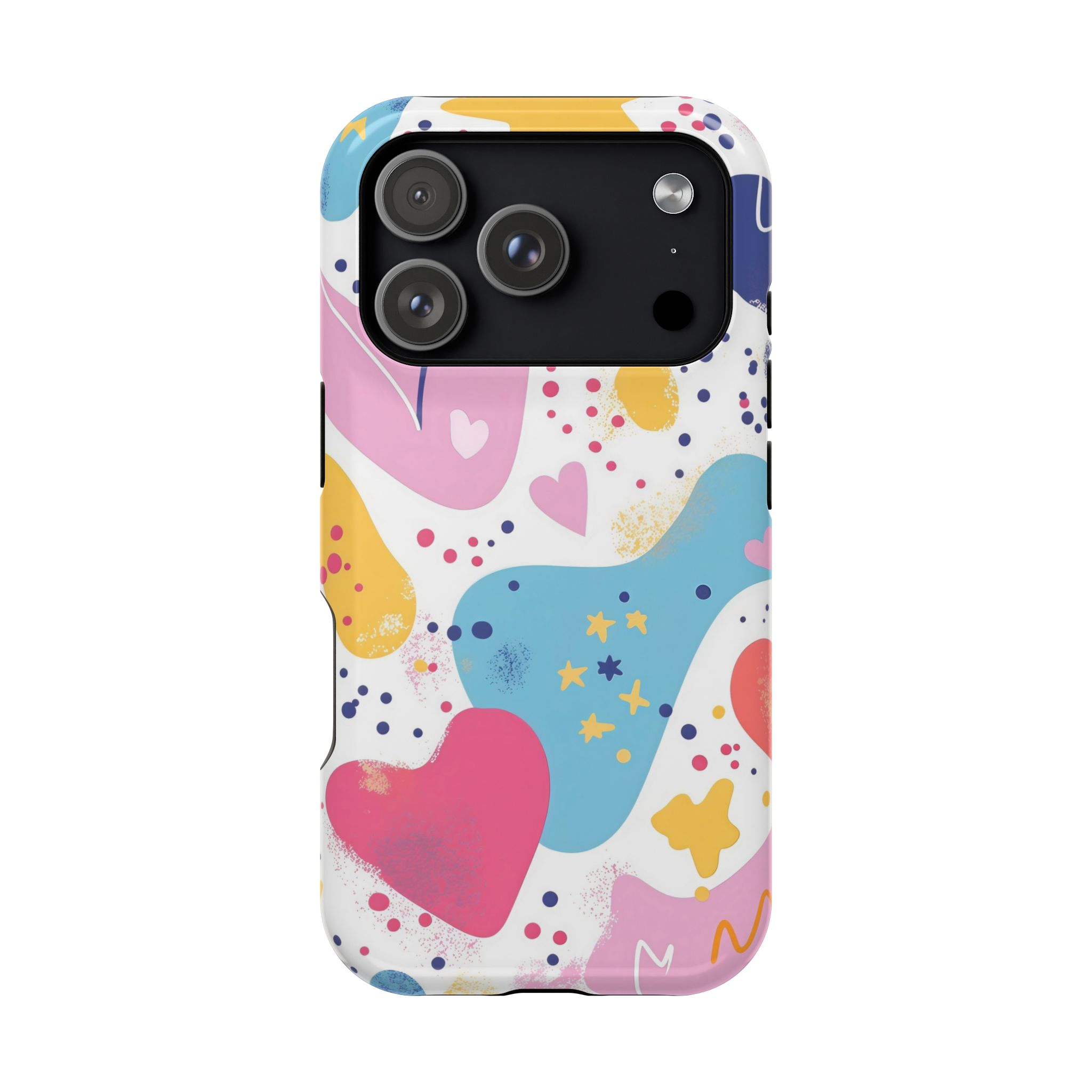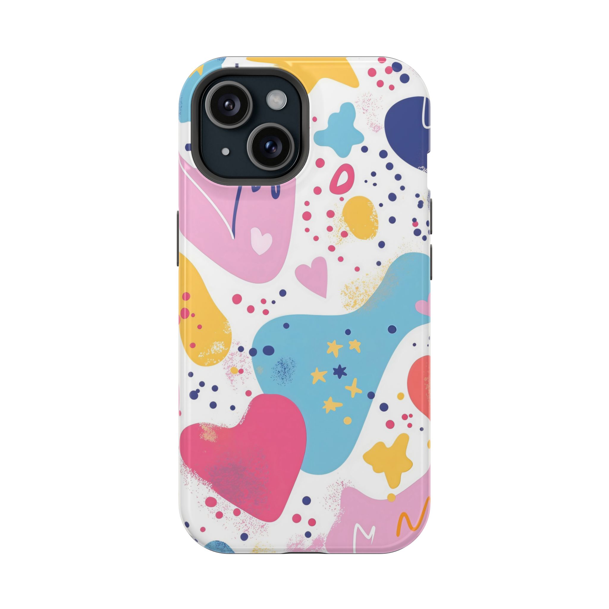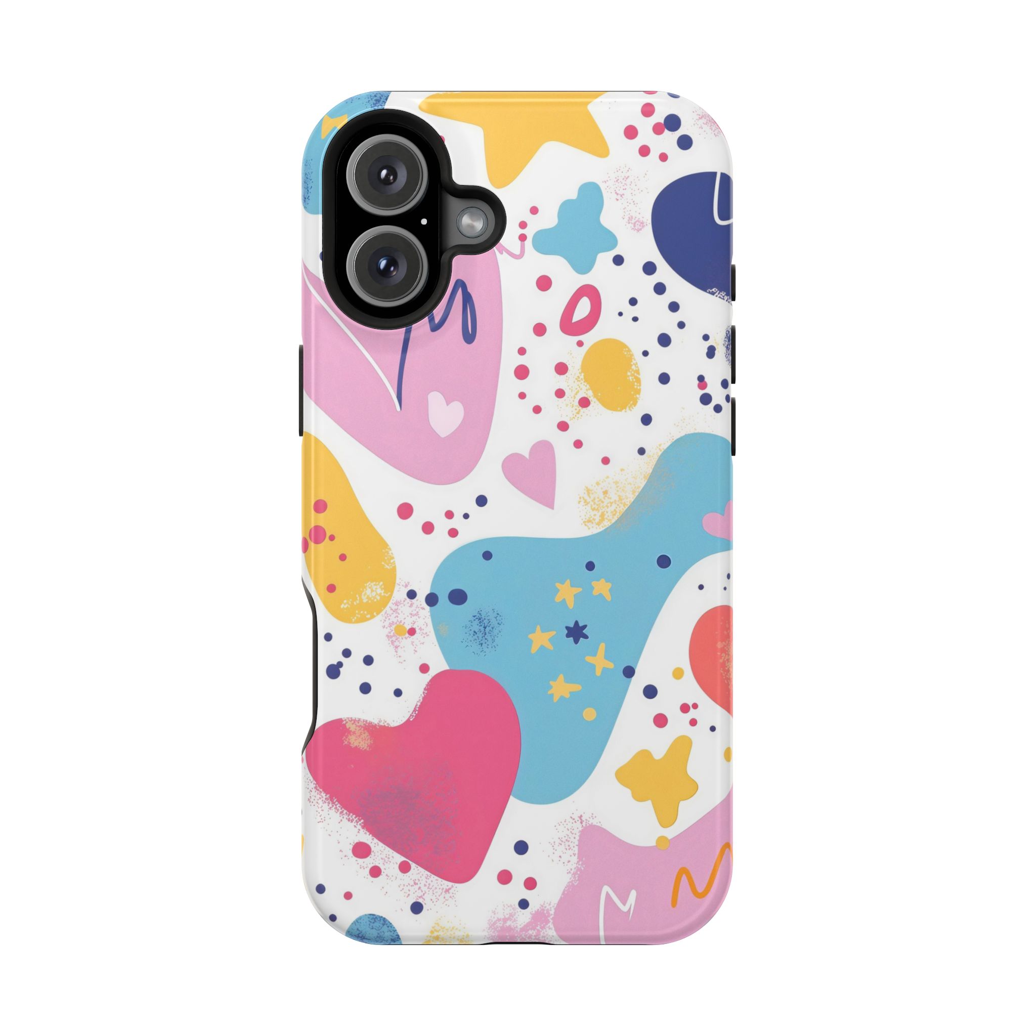 This Starry Hearts Color Splash Case brings a fun, expressive aesthetic to your iPhone with its vibrant mix of hearts, stars, and abstract shapes. The design features splashes of pink, yellow, blue, and purple, all blended into a cheerful pattern that feels artistic and youthful. Each shape has a soft, textured, hand-painted look, giving the case a doodle-inspired charm perfect for creative personalities.