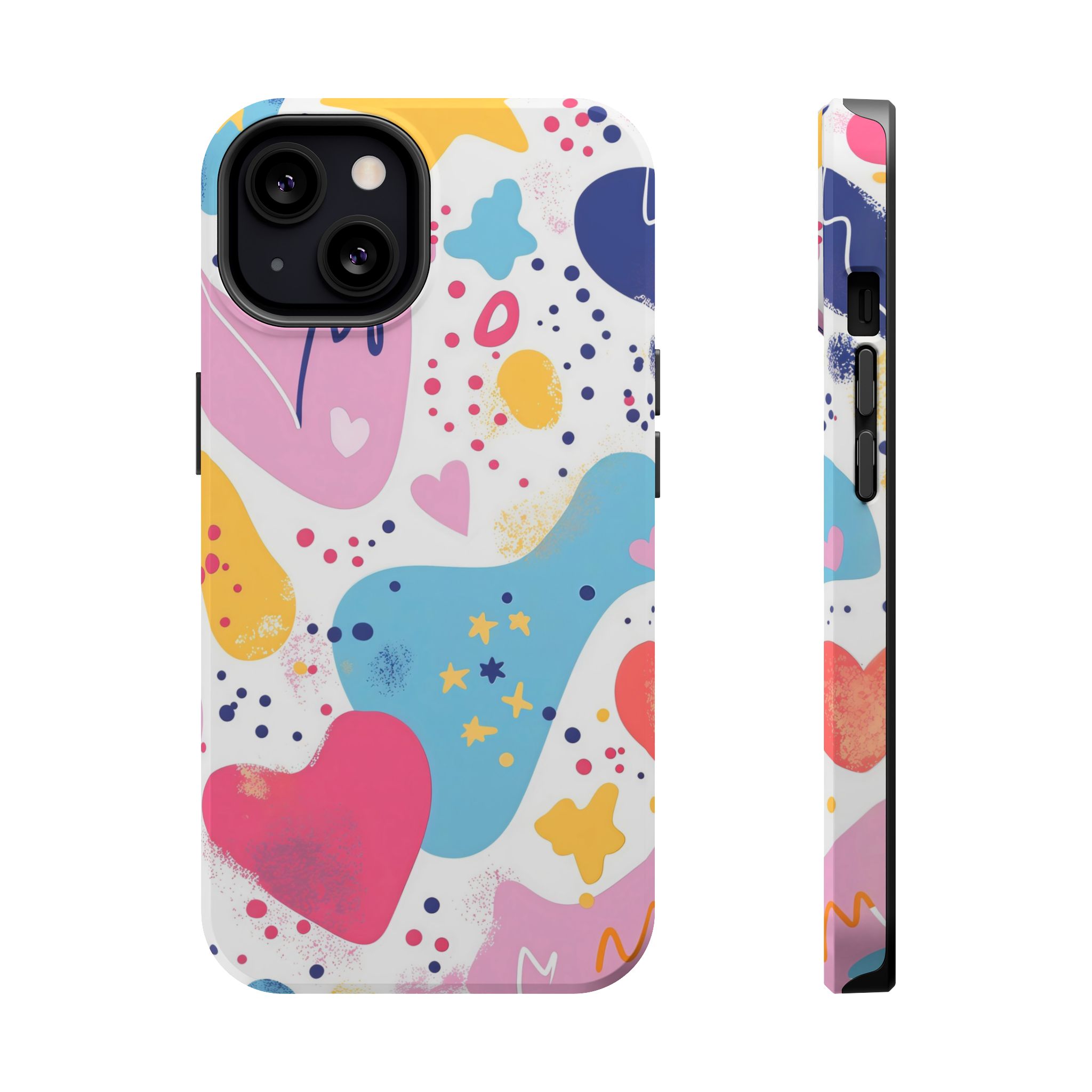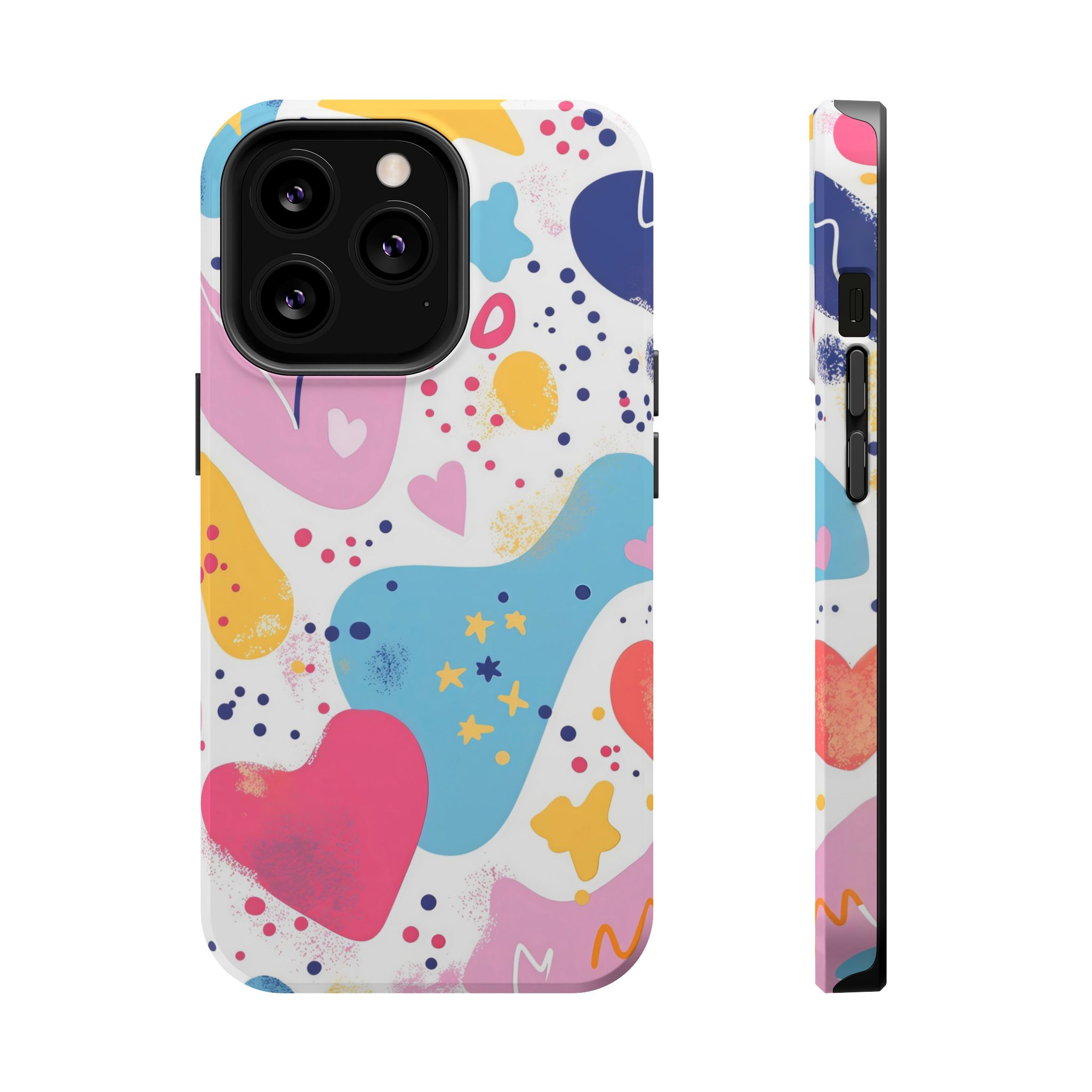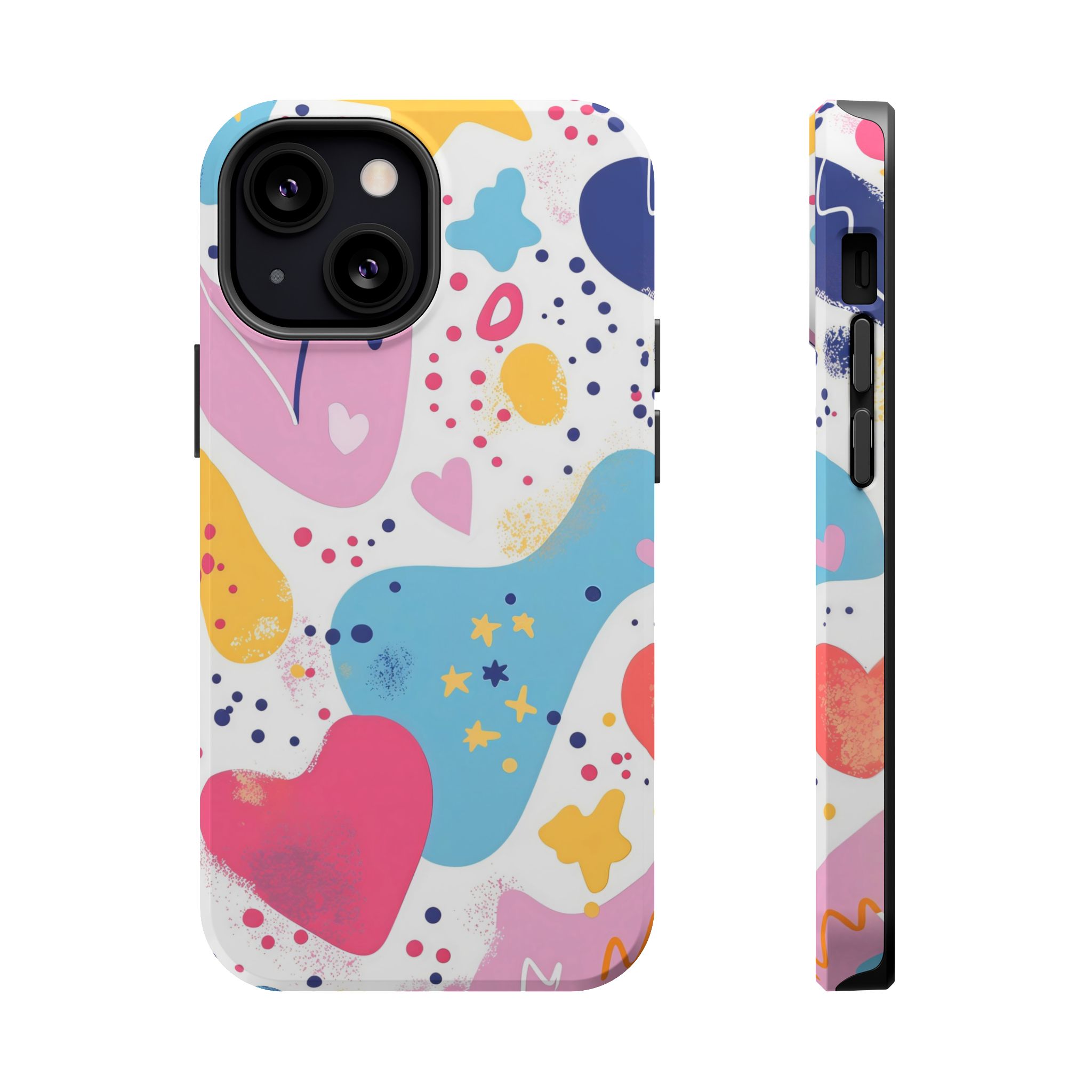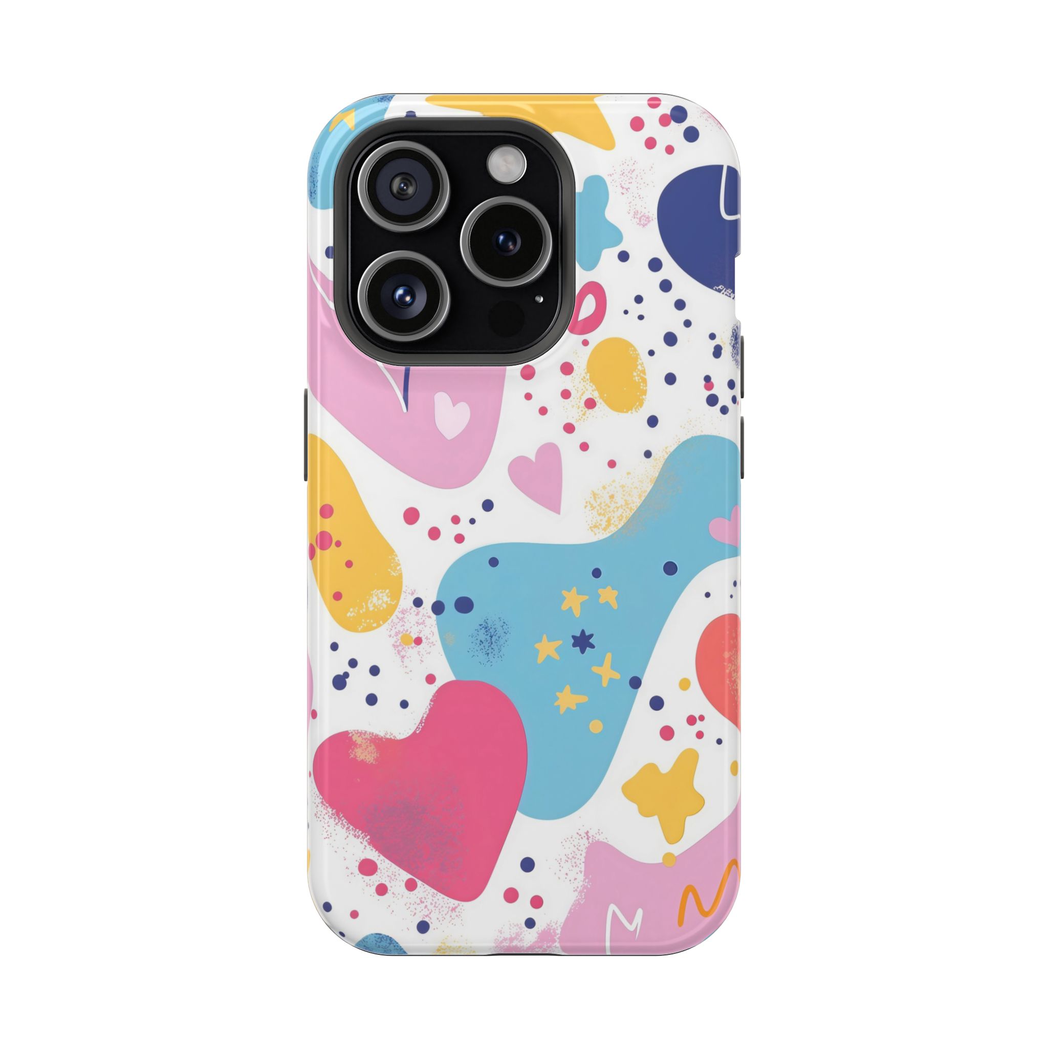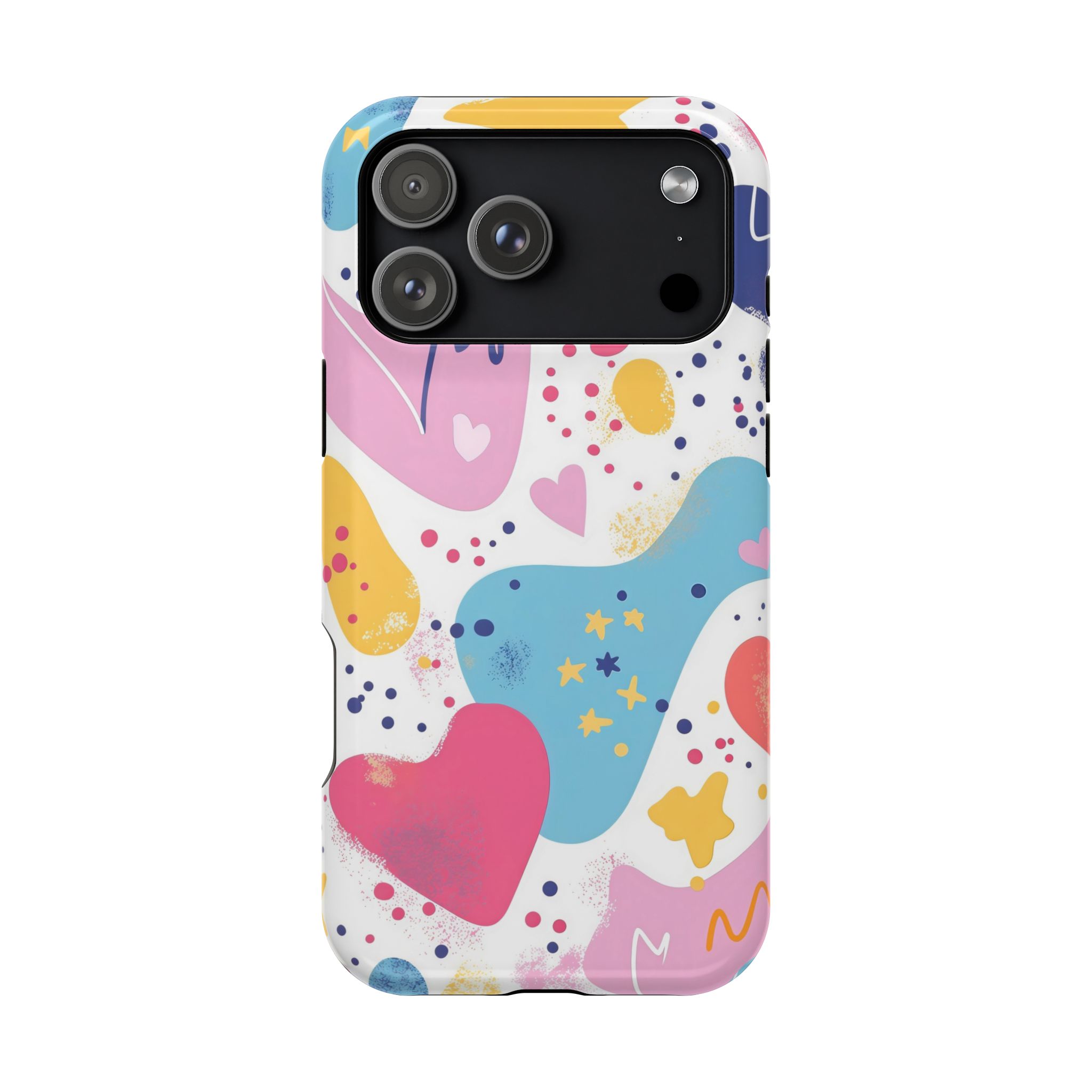 This Starry Hearts Color Splash Case brings a fun, expressive aesthetic to your iPhone with its vibrant mix of hearts, stars, and abstract shapes. The design features splashes of pink, yellow, blue, and purple, all blended into a cheerful pattern that feels artistic and youthful. Each shape has a soft, textured, hand-painted look, giving the case a doodle-inspired charm perfect for creative personalities.