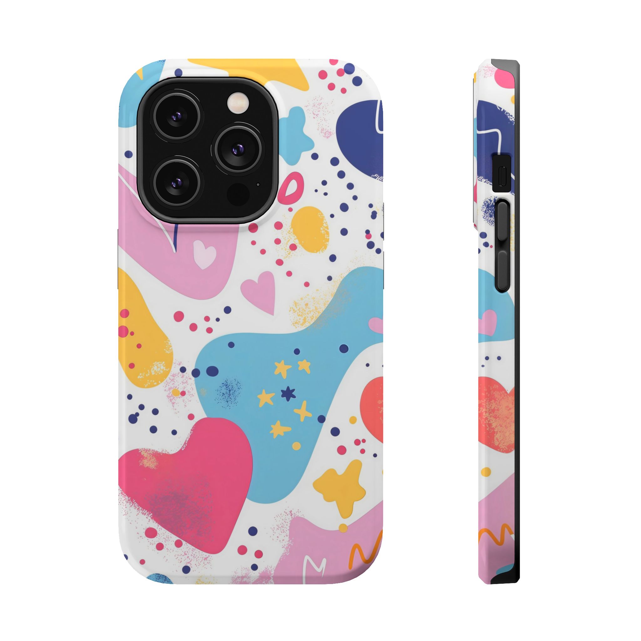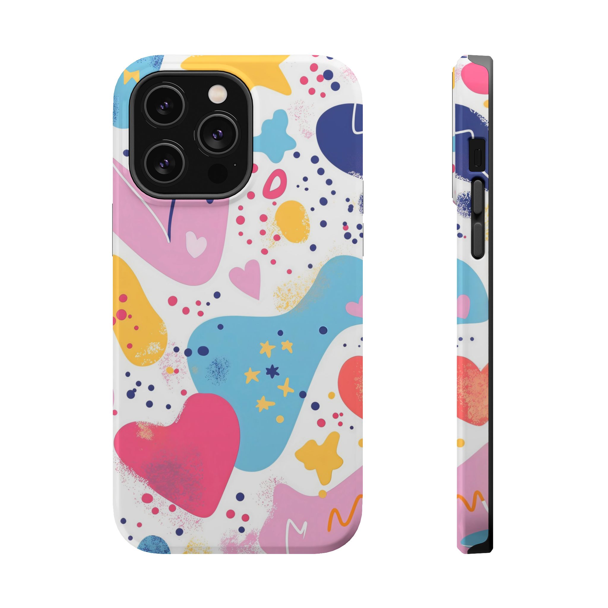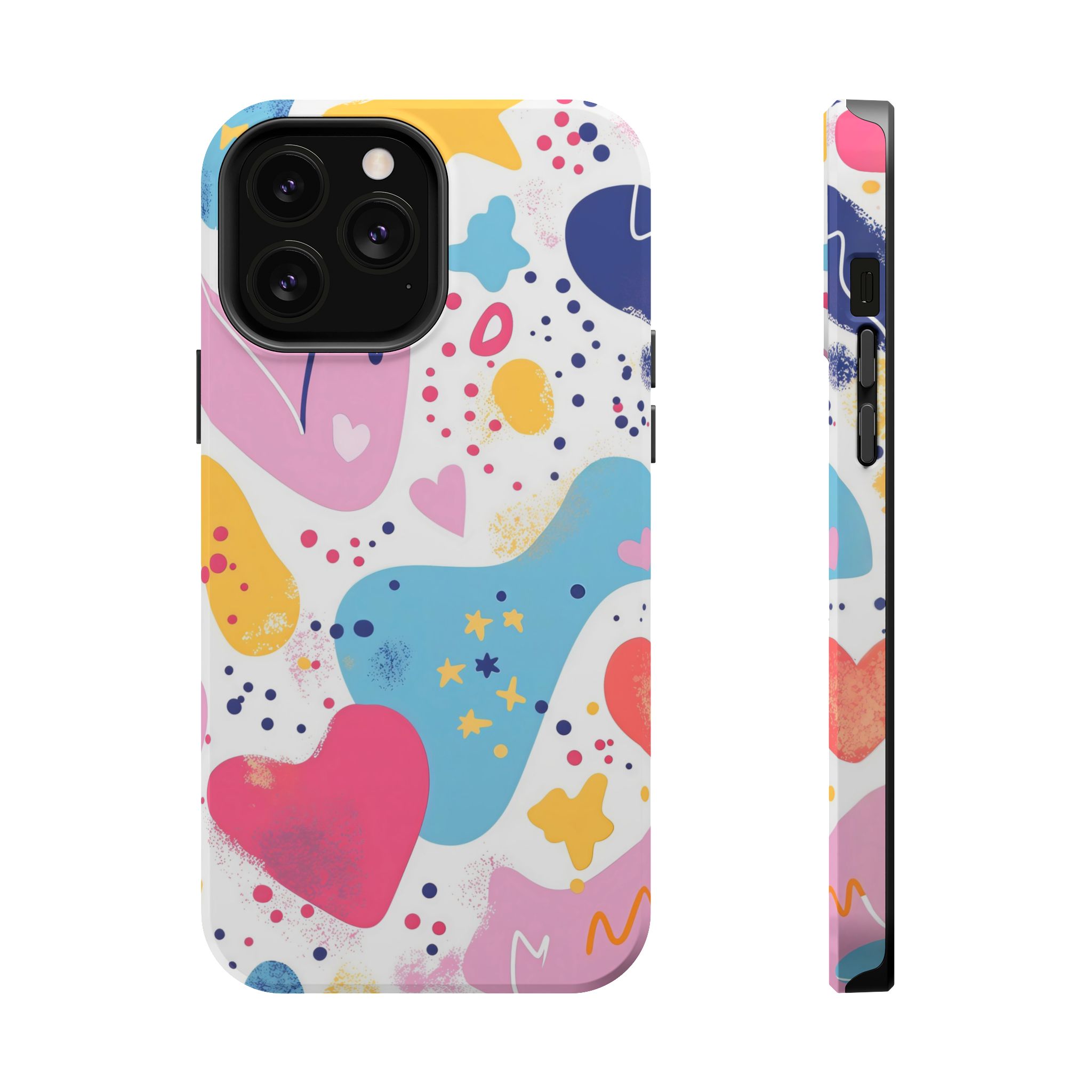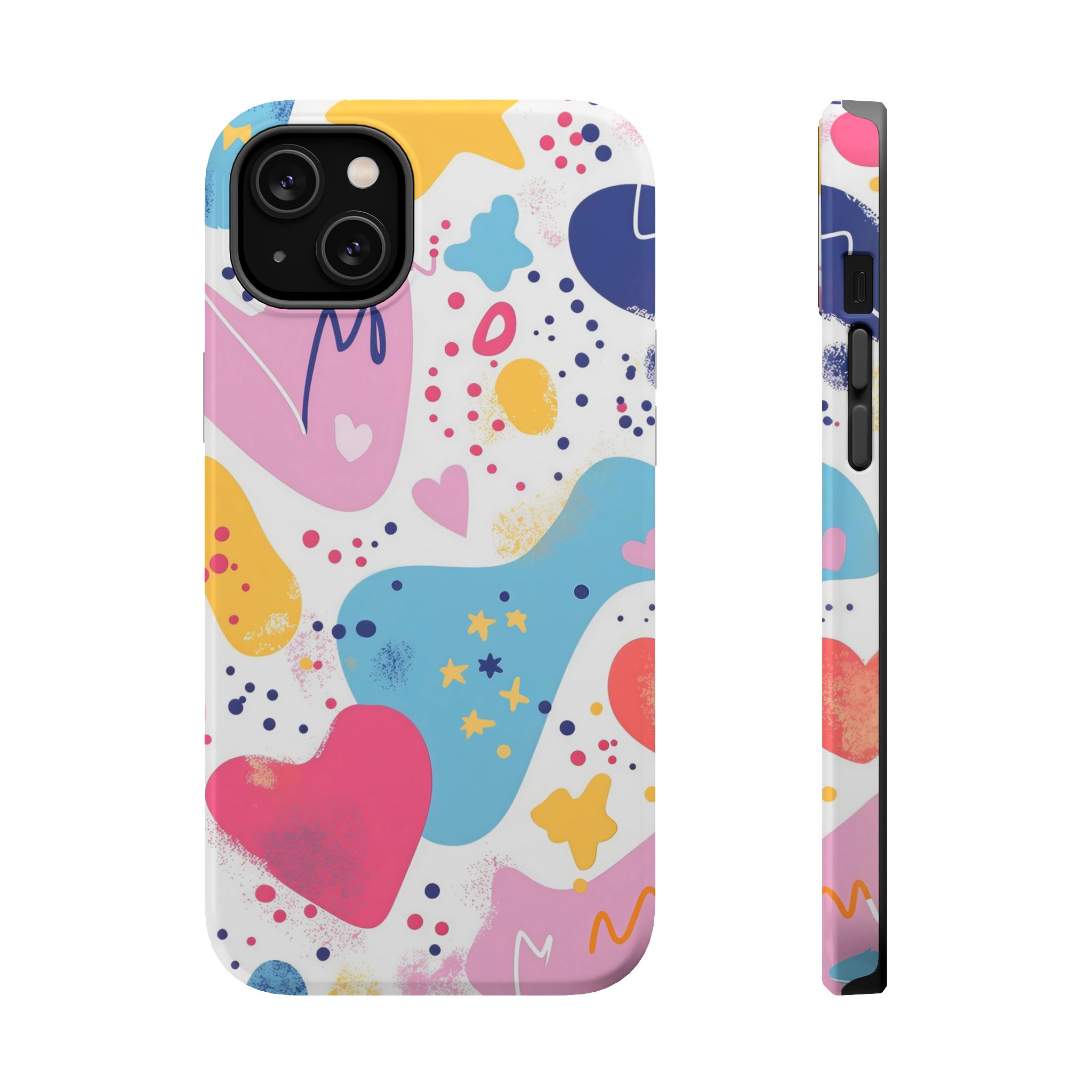 This Starry Hearts Color Splash Case brings a fun, expressive aesthetic to your iPhone with its vibrant mix of hearts, stars, and abstract shapes. The design features splashes of pink, yellow, blue, and purple, all blended into a cheerful pattern that feels artistic and youthful. Each shape has a soft, textured, hand-painted look, giving the case a doodle-inspired charm perfect for creative personalities.